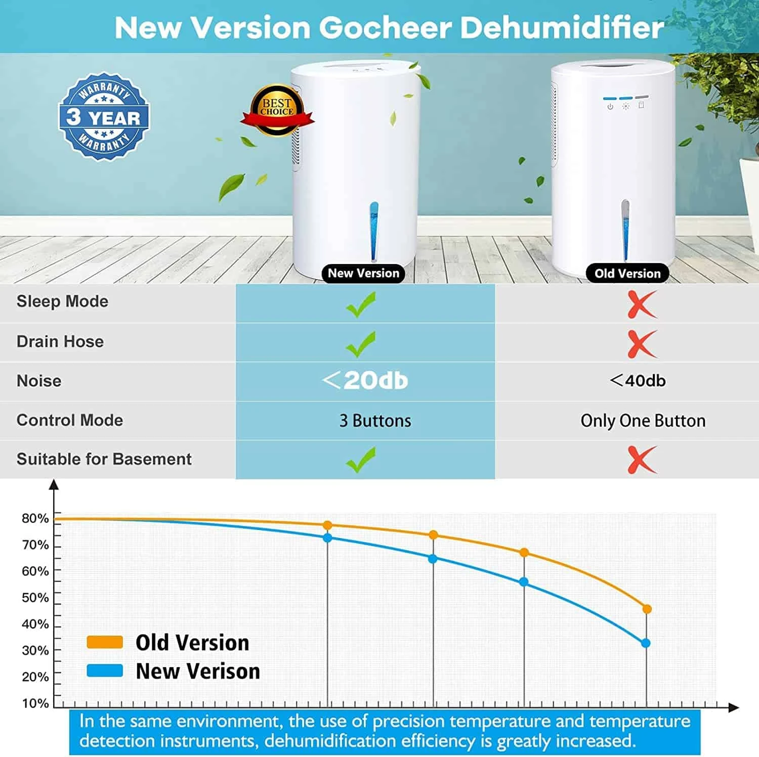 - High-Efficiency Dehumidification: Upgrade to a healthier home with Gocheer’s dehumidifier, featuring a 2000ml tank and removing up to 45OZ of moisture daily (at 86°F and 80%RH). Ideal for 107-800 sq ft rooms