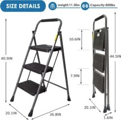 - SUITABLE SIZE: 3 step ladder open size: 40.9″ x 26.8″ x 20.1″, folded size: 44.5″ x 20.1″ x 1.6″, suitable for homes, kitchens, offices, garages and other places. The upgraded 3 step stool provides you with a perfect feeling of using.