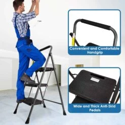 - ANTI-SLIP & STABILITY: The widened pedals with an anti-slip particle surface give full support to the feet. The thickened rubber ladder feet fully contact the ground and the comfortable rubber handgrip design enhances the safety and stability of the ladder.