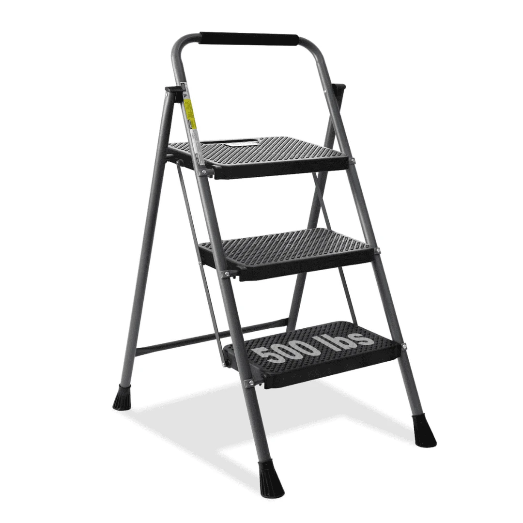 3 Step Ladder, GOLYTON Folding Step Stool with Anti-Slip Wide Pedal & Convenient Handgrip, 500lbs Capacity Steel Ladder for Household and Office, Grey