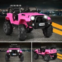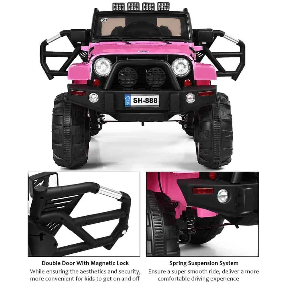 This is our kids ride on truck which is the perfect gift every child will be sure to love! This electric toy provides a fun driving experience for children, utilizing two motors powered by 12V 7AMP battery. It comes with realistic car details that your kids will surely love: uniquely designed look, MP3 player, music and horn sound, forward and reverse function, and lights that turn on and off, etc.. children can drive themselves, or can simply enjoy a trip while parents control it using a remote control. It must be mentioned that soft start function and spring suspension system further ensure the safety of children driving. Bring healthy and more wonderful childhood to your children. Don’t hesitate to buy it!…Cool appearance that attracts children’s eyes;…MP3 player: equipped with aux input, USB port and TF card slot, connect your device to play music or stories, ride more enjoyable;…forward and reverse functions, 3 speeds on remote control for adjustment;…double door with magnetic lock, bright front and rear LED lights;…comfortable seat with multi-point safety belt, large space to sit and play;…wear-resistant and explosion-proof wheel PP wheels, no need to inflate;…portable design, built-in handle for easy movement; portable design, built-in handle for easy movement; A perfect gift for children, provides healthy exercise and plenty of fun; naturally develop hand-eye coordination ability in play and laughter; adjustable volume design; assembly required; color: pink; main material: PP + iron; overall dimensions: 46.5 x 31 x 29 inch(L x W x H); net weight: 35 lbs; weight capacity: 66 lbs;…speed: 3-6 km/h;…charge time: about 8-12 hours;…battery: 12V 7 AH x 1;…motor: 12V x 2;…recommended for ages: 3-7 years old;…certification: UL;…Package includes: x kids ride on truck;…1 x 2.4GHZ remote control;…1 x charger;…1 x instruction.