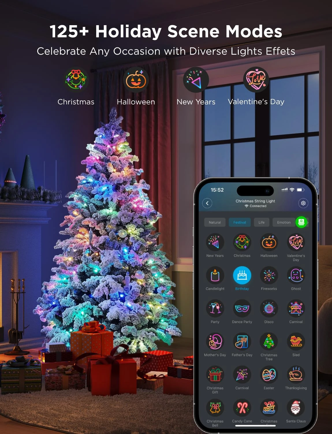 - 125+ Dynamic Scene Modes: The versatile preset modes of Govee string lights are designed to meet every demand for any occasion. Celebrate with diverse lighting for artificial palnts indoor, living rooms, tree trunks, patios, gardens, fences, etc.
