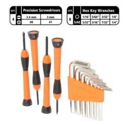 - What’s Included: 6″ Slip Joint Pliers, 8 oz. Curved Claw Hammer, 10′ Tape Measure, 8″ Pair of Scissors, Snap-Off Utility Knife, (4) Precision Screwdrivers Slotted 2.4 mm., 3 mm., Phillips #0, #1, (8) Hex Key Wrenches in a Holder SAE 1/16″, 5/64″, 3/32″, 1/8″, 5/32″, 3/16″