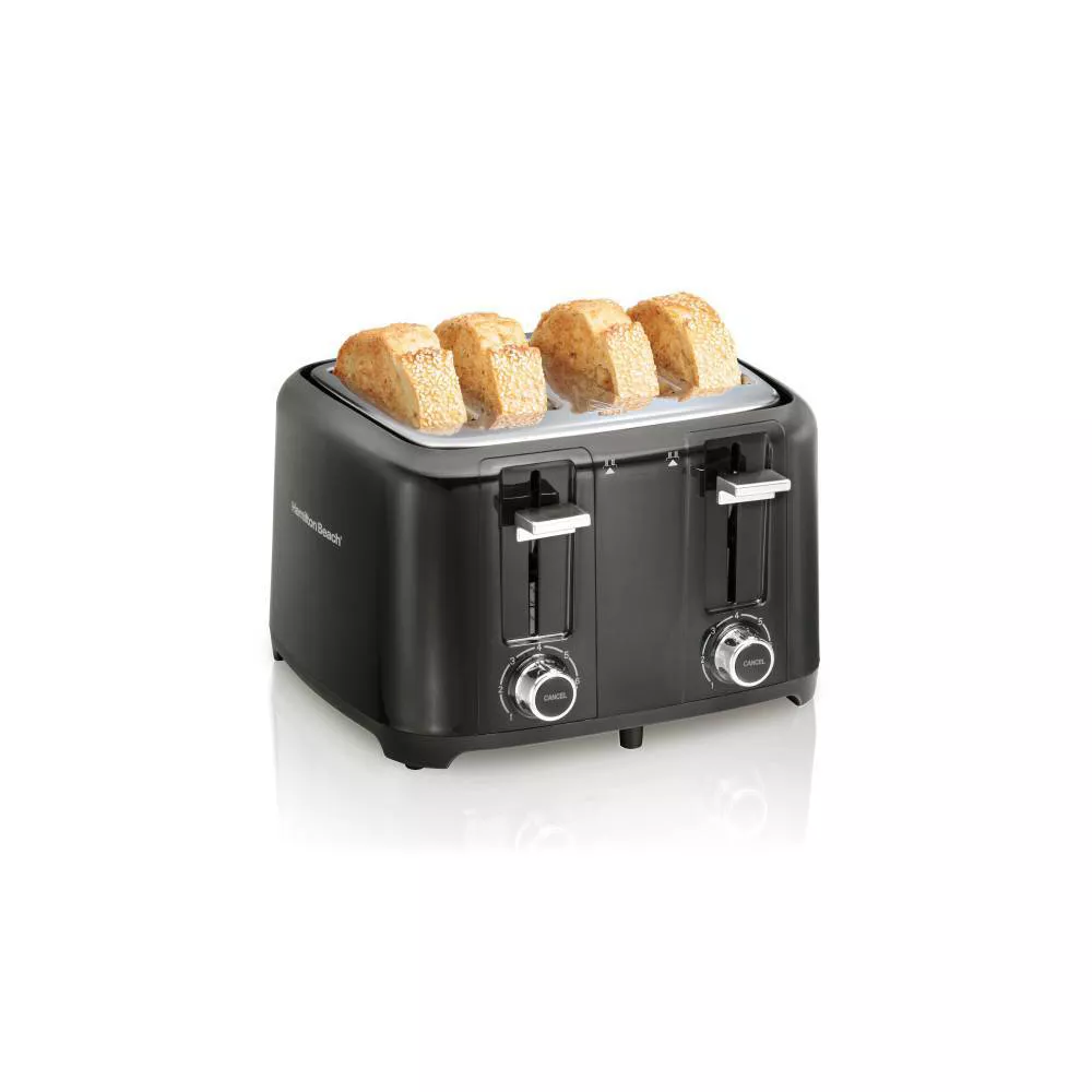 With the Hamilton Beach® 4 Slice Toaster with Extra-Wide Slots, you’ll easily toast thicker breads like Texas toast and bagels. Make perfect toast every time to enjoy for snacks or with meals. From bagels and lox for breakfast to open-faced roast beef sandwiches for dinner, you’ll find lots of ways to get creative with toast using this wide-slot toaster. Toast Boost lifts smaller breads higher so they’re easier to retrieve from the toaster. No more struggling to get your toasted English muffins and gluten-free slices from the toaster. With 2 sets of independent controls, this toaster does the job of 2 toasters in 1. It lets you toast different breads, stagger toast start times, and customize the toast shade on each side of the toaster. Choose from 7 toast shades for lighter or darker toast. Press the integrated Cancel button on the shade selector to stop the toasting cycle anytime. This 4 slice toaster has 2 slide-out crumb trays that catch crumbs for easy cleanup. For peace of mind, the toaster automatically shuts off at the end of the toasting cycle, even if toast gets jammed. The cord wrap neatly hides away excess cord and makes storing the toaster easy.
