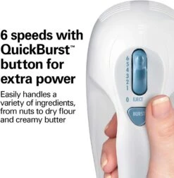 - 6 speeds with QuickBurst button. This versatile hand mixer has 6 different speed options, plus a QuickBurst button for an extra burst of power when you need it. It easily handles a variety of ingredient, from nuts to dry flour and creamy butter. Rest stabilizer Six speeds with Quick