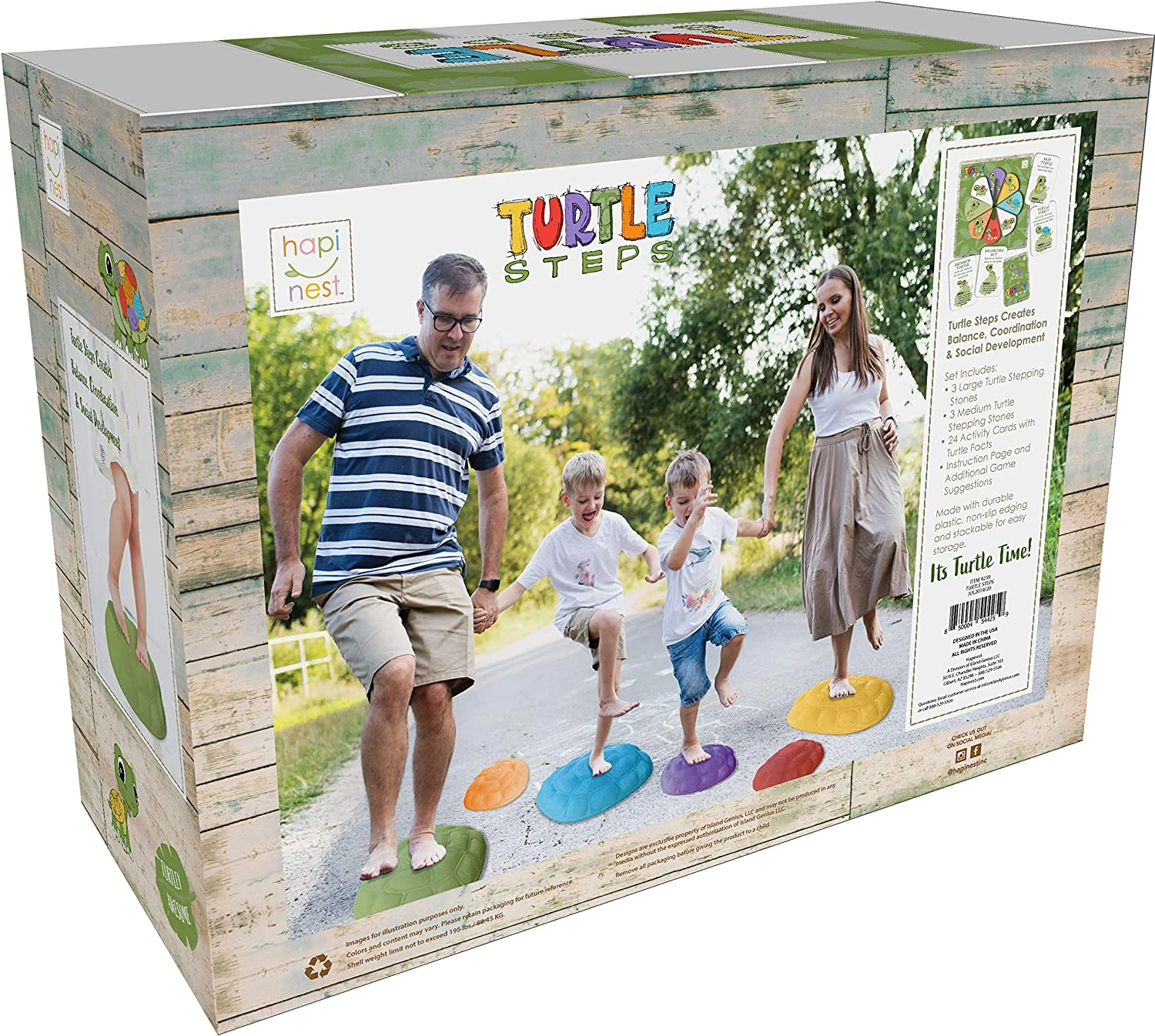 - This set includes 3 large turtle shell stepping stones, 3 medium turtle shell stepping stones, 24 activity cards with turtle facts, colorful spinner, instructions, and additional game suggestions.