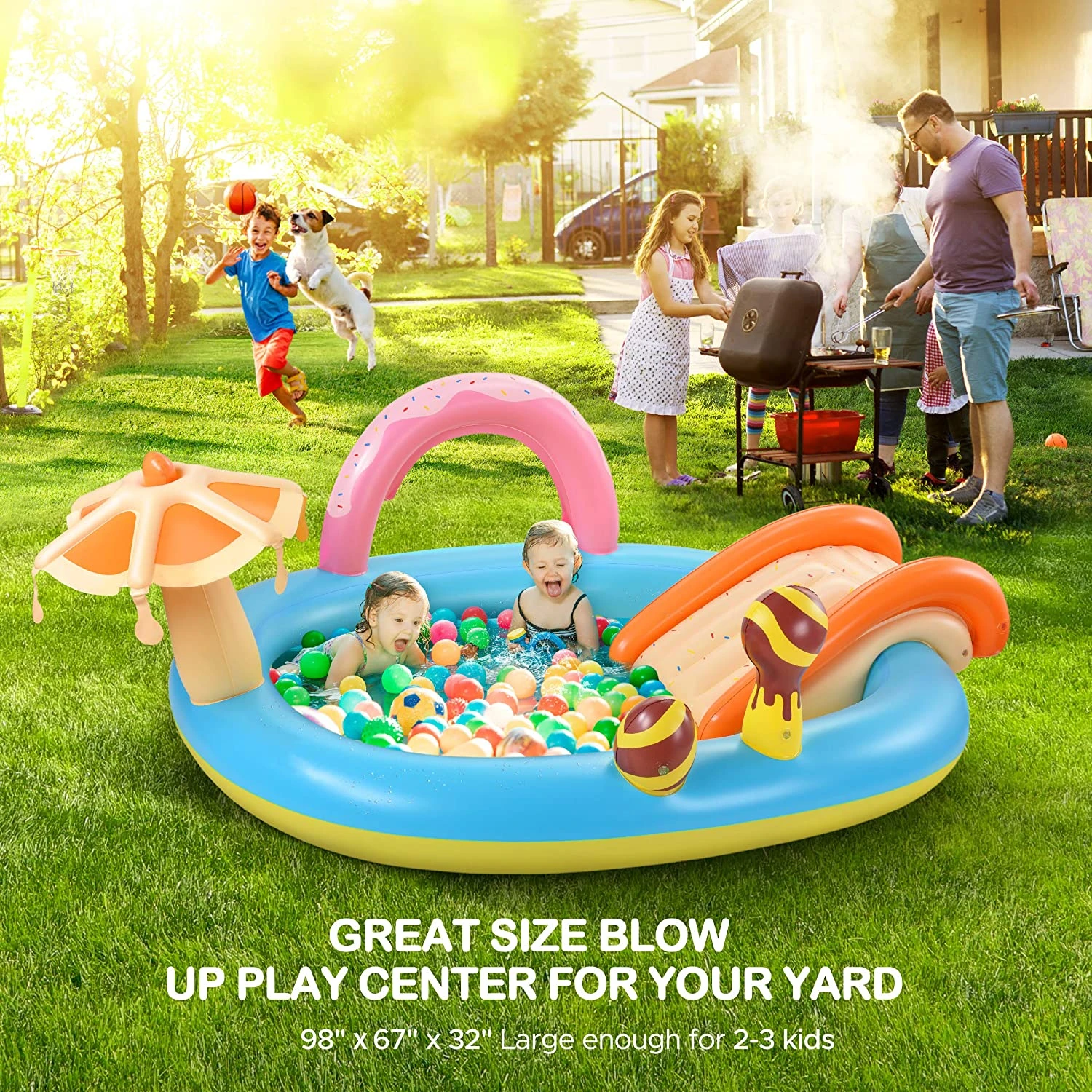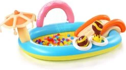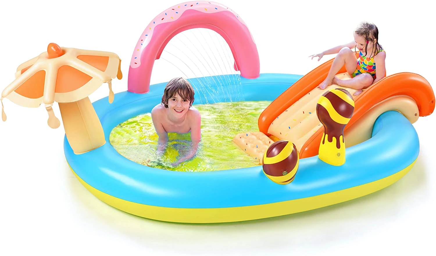 - Fun splash in all summer: Features a water slide, water sprayer attaches to fountain arch keeps kids cool in summer. Fun games for children, two BPA-free PVC lollipops and two rings included, even good for playing indoors as a ball pit.
