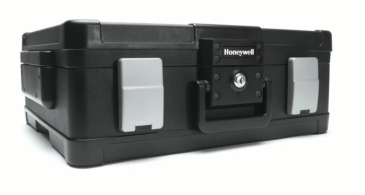 The Honeywell 1114 Lightweight Fire resistant and Waterproof Chest features a storage capacity of .39 cubic feet. Secure unprecedented levels in peace of mind with this chest’s ability to withstand a fire of up to 1700° F for one hour! The addition of a waterproof seal and two side latches guards against emergency sprinklers, floods and various other forms of water damage. These features make it an ideal candidate for stashing all of your personal documents, digital media and various other valuables. The security box is also large enough to store your legal sized papers flat. For security measures, this waterproof chest utilizes a key lock system. Includes two keys. A carry handle is also included and adds even more versatility to an already flexible product. The Honeywell Safe product line provides safety and security for your essential documents and most valuable possessions while affording you the peace of mind that comes from being prepared in the event of a disaster, fire, or an invasion of your home or office. 5 Year Limited Warranty.