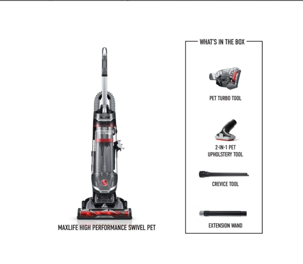 The Hoover MAXLife High-Performance Swivel Pet Upright Vacuum Cleaner Machine is ready to take on tough messes like crumbs, pet hair, and even deeply embedded dirt. Itâs equipped with a filter made with HEPA Media that captures up to 99% of dust and fine particles, while its edge-to-edge suction packs a punch to messes hiding in hard-to-reach spots. No matter the floor type, the PowerPass Brush Roll gets the job done. Since itâs designed with our new MAXLife Filtration System and WindTunnel Technology, the High-Performance Swivel Pet Vacuum Cleaner not only cleans with the strong suction you need to power through messes but also performs like new for 3X longer.