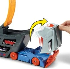 This awesome rig holds up to 18 cars, but look again, this is no ordinary hauler, this is a mobile play set, the first ever hauler with a loop! Snap the two sides of the loop in place and swing out the collapsible launcher, then pull the cab at the front to create a dramatic jump. Launch through the loop and land the jump over and over again, or add additional track for an even longer jump. The Stunt & Go transforming transporter is totally portable for stunting action anywhere, anytime! Fold the entire play set back up, load your cars in the truck bed and roll off until your next Hot Wheels stunt show.