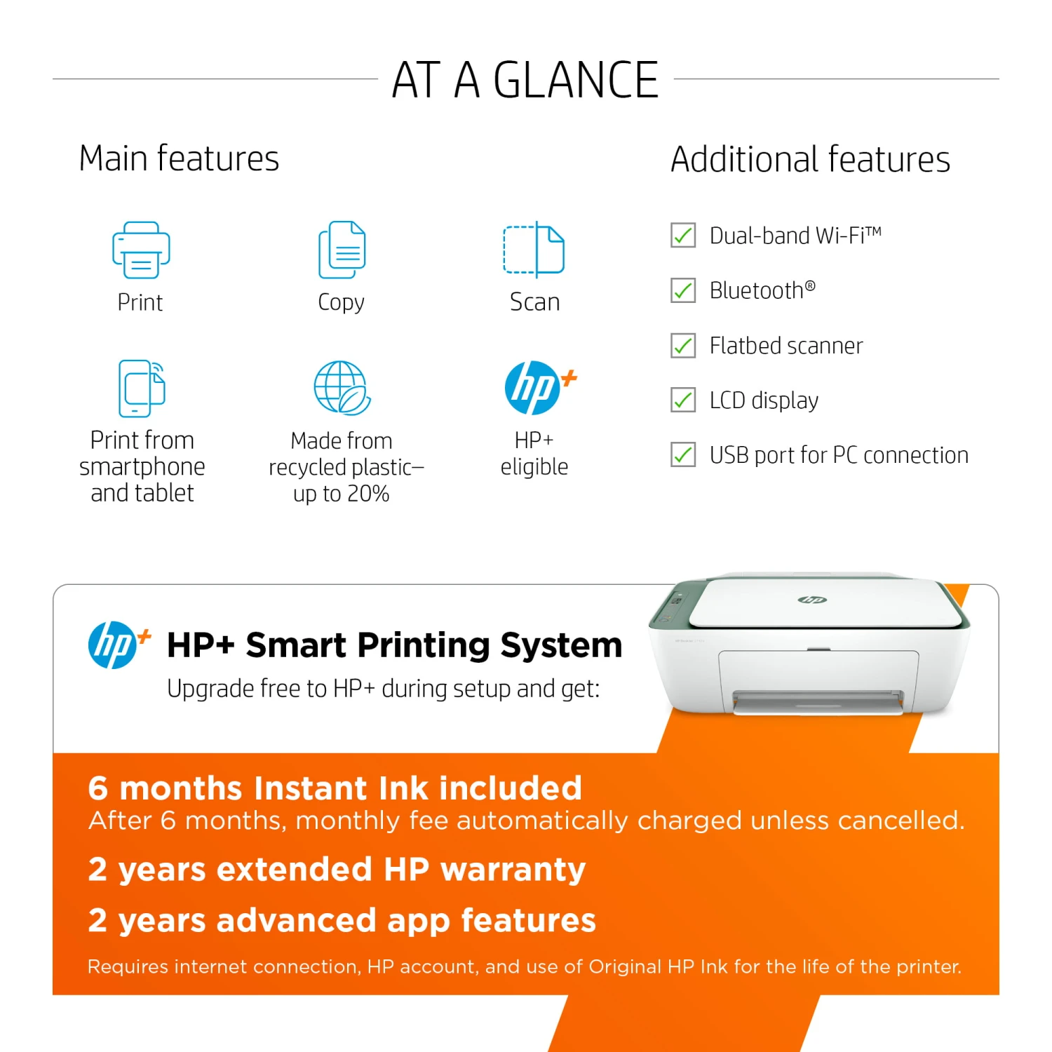 The HP DeskJet 2742e has the essential features you need to print basic color documents like recipes and forms. Print, copy and scan with ease, print from your phone and get easy setup. Includes the optional HP+ Smart Printing System that keeps itself up to date and ready to print from virtually anywhere at any time—at no additional cost.