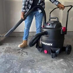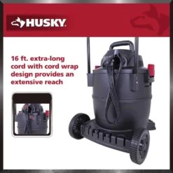 The Husky 16 Gal.* Polly Cart Design Wet/Dry Vac features a strong handle for easy portability. Its large on/off switch and swiveling casters provide ease of use no matter the chore. The built in tank makes draining an ease. Whether you need to tackle a wet or dry mess, let this vac help you make short work of any job. *Tank capacity refers to actual tank volume and does not reflect capacity available during operation.**Peak Horsepower” (PHP) is a term used in the wet/dry vacuum industry for consumer comparison purposes. It does not denote the operational horsepower of a wet/dry vacuum but rather the horsepower output of a motor, including the motor’s inertial contribution, achieved in laboratory testing. In actual use, motors do not operate at the peak horsepower shown.