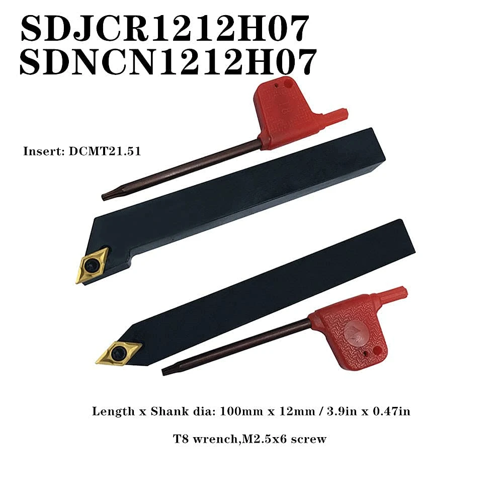 - Right hand SDJCR1212H07/SDNCN1212H07: length:4in, shank dia:0.47in ,with 2 piece DCMT21.51 Inserts