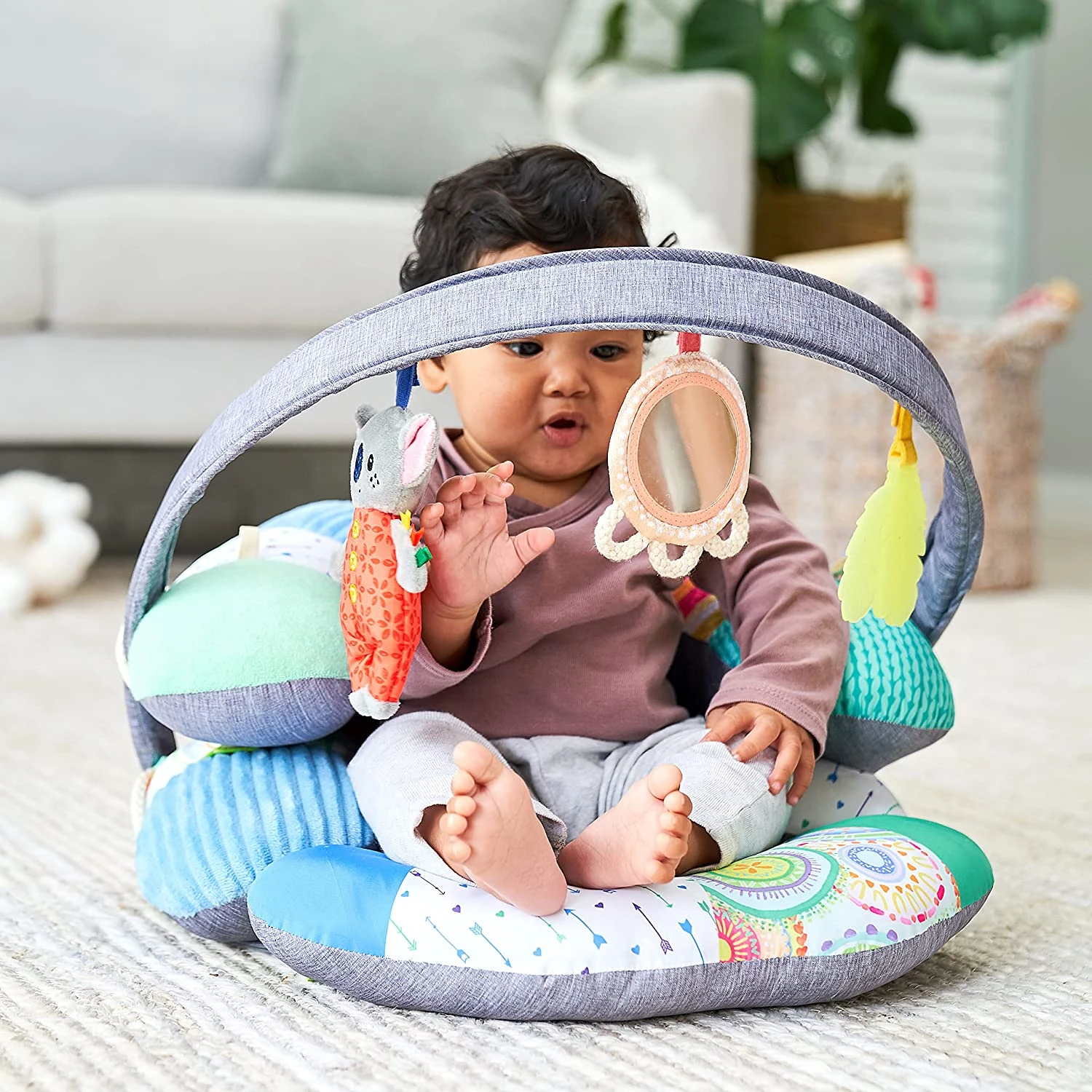 - SEATED PLAY – stacking the tummy-time prop transforms it into a secure, hugging “C” shaped positioner for early sitting playtime; adding the toy arch and repositionable toys creates a mini gym for entertaining prop-up play