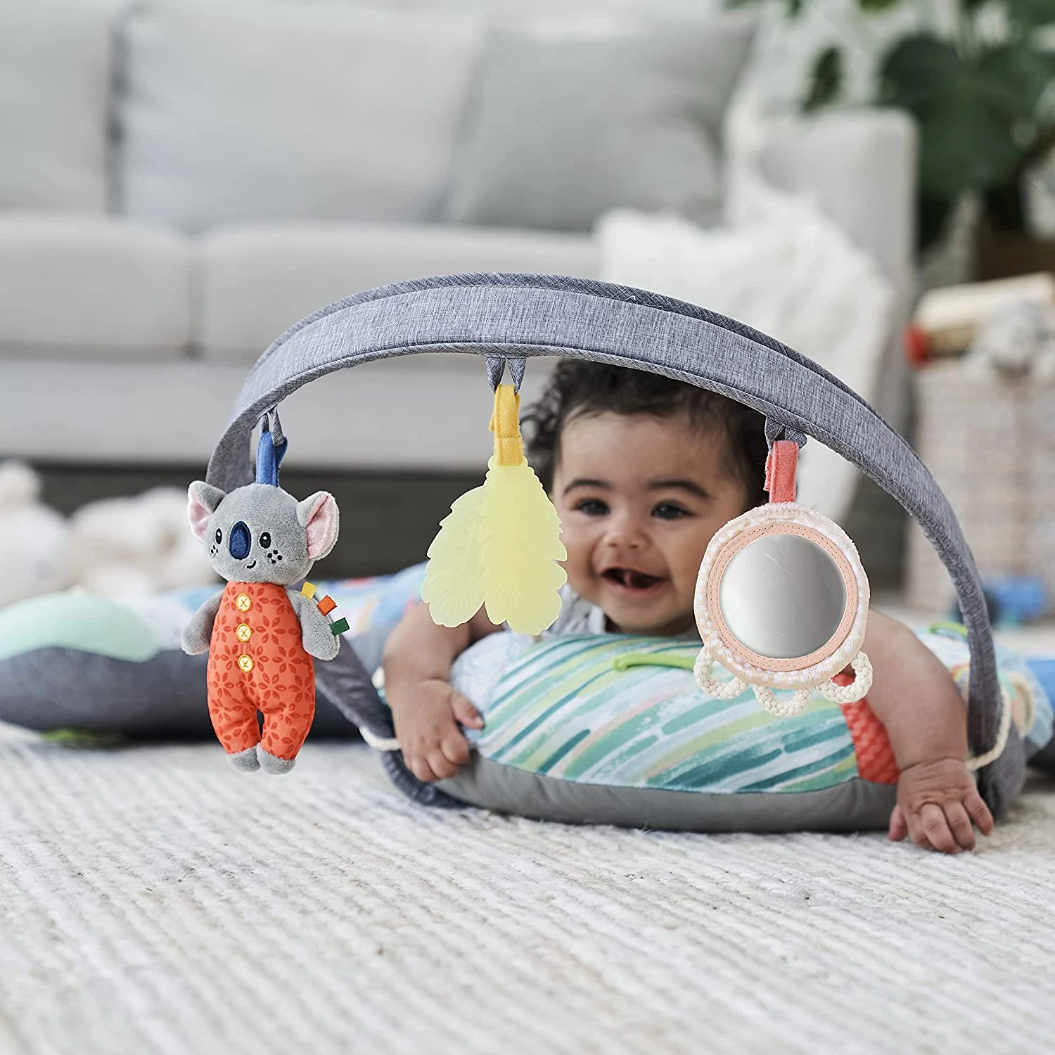 - ENGAGE & EXPLORE – Babies love to touch, gaze and listen to a soft, textured, musical koala character; a peek & see mirror stimulates curious little minds when they see their own reflection; a soft, BPA-free textured leaf teether helps to ease sore gums
