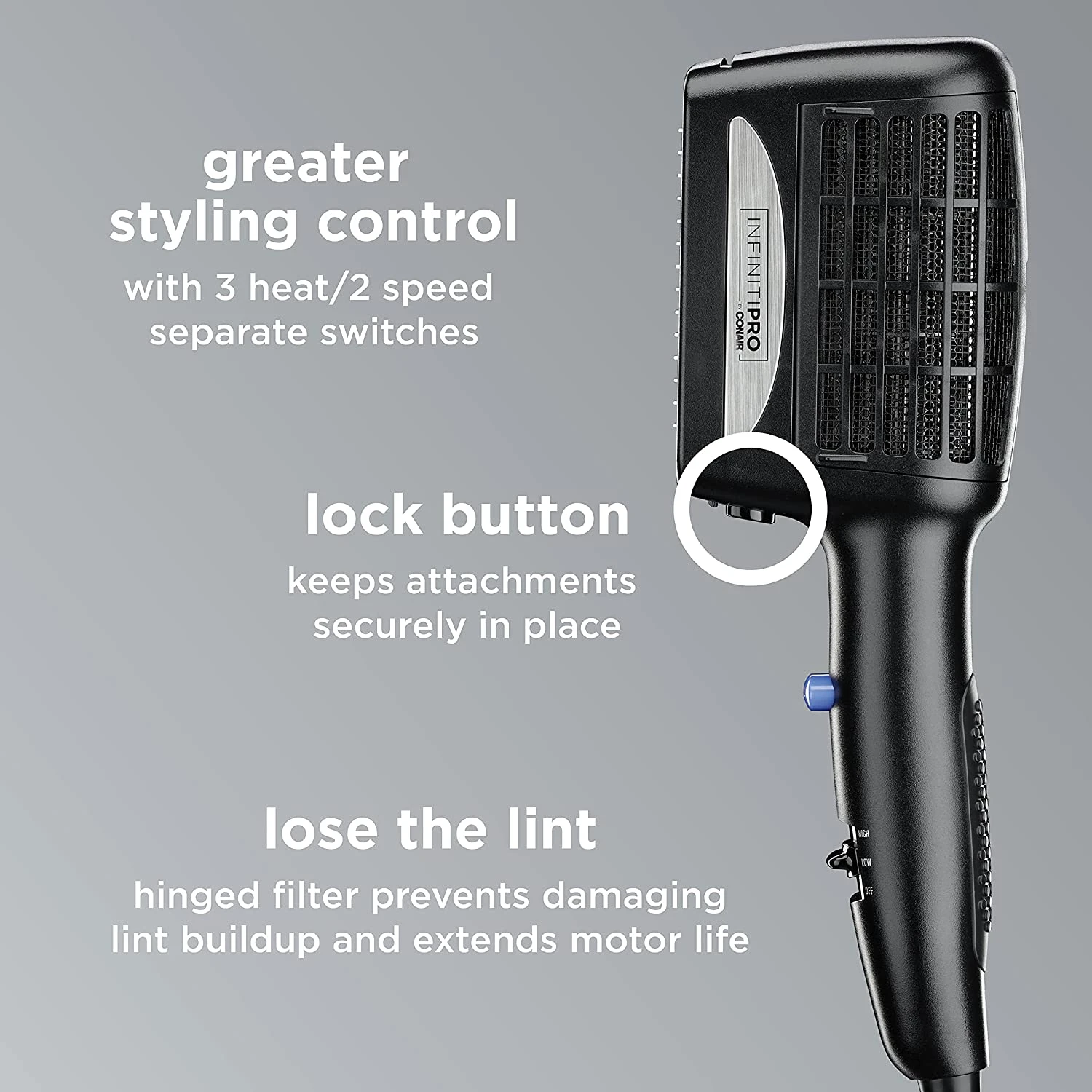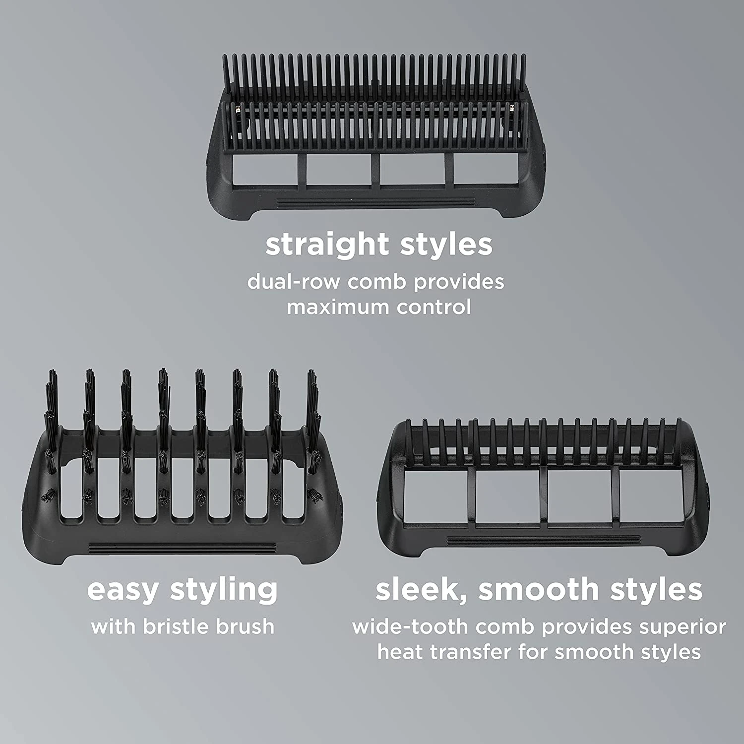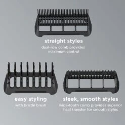 - Versatile Use: Includes three attachments for a variety of looks and styles: Bristle Styling Brush, Dual Row Straightening Comb and Wide Tooth Detangling Comb; Lock Button keeps attachments in place while styling