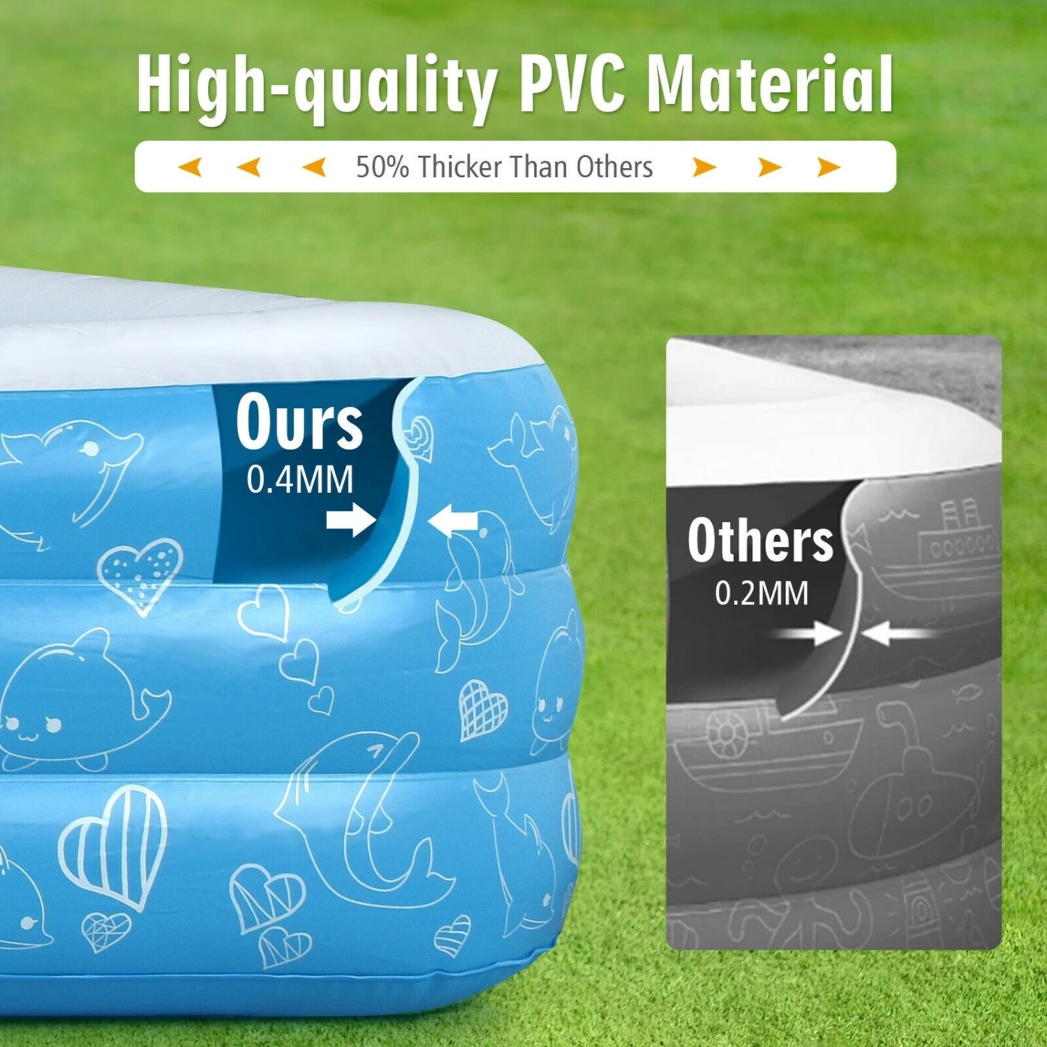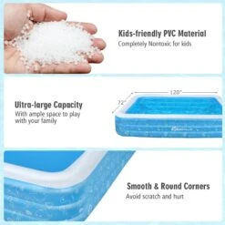 - 3.Wear-resistant and Safe Material: Crafted with premium PVC material, this swimming pool features long-lasting durability. Plus, it’s totally safe and non-toxic for kids to use, so there’s no need to worry about using reliability. Smooth and round corners offer thought protection, and prevent from hu
