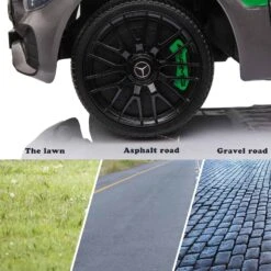 This kids ride-on is fitted with practical functions including forward or backward running, instant parking, high or low speed, all controlled by a 3-gear shift lever and a speed-switch button, and volume-adjustable audio system which contains 3 modes of English-learning mode, story-telling mode and nursery rhyme singing mode as well as easy accesses to more audio resource through the built-in TF card slot, 3.5mm aux input and USB interface. Besides, the dash board with backlight and the digital screen that displays the battery voltage provide more fun of immersion driving.