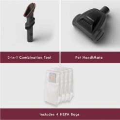 - VERSATILE TOOLS: Includes a 3-in-1 combination tool, dusting brush, Pet HandiMate, and 4 HEPA bags.
