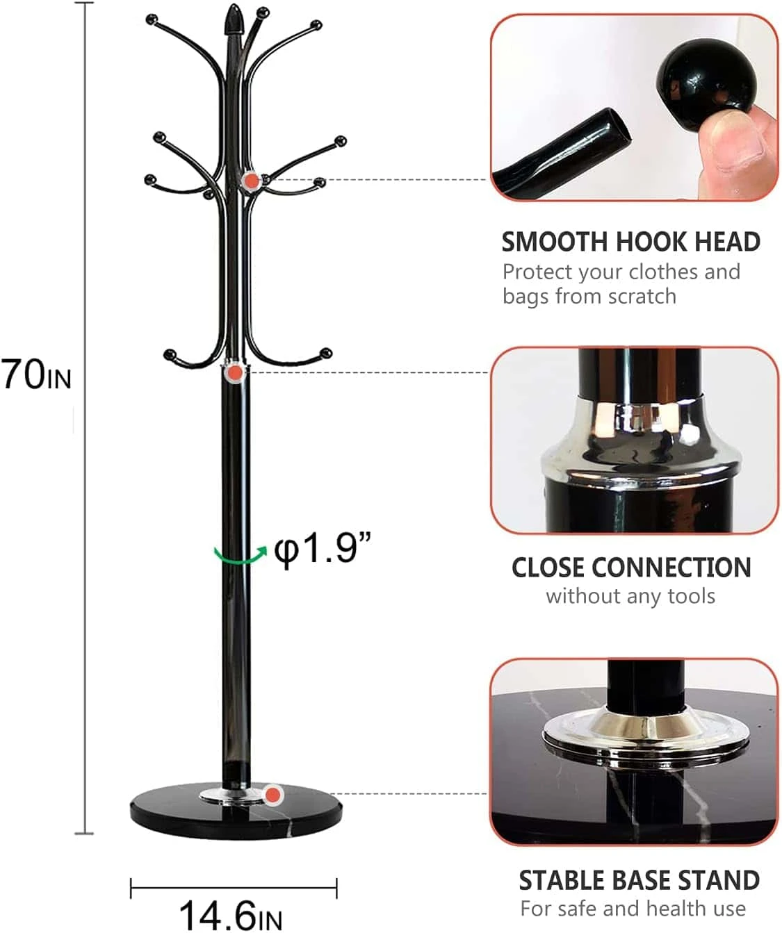 - 12 Hooks with Smooth Ball on Top: The free standing coat rack is small in size and powerful in storage. 12 hooks are designed in a staggered level, which can make full use of the small space and hang more items. Down jackets, thick coats, big bags, umbrellas, and scarves are all hung at ease, with excellent bearing capacity. The unique small ball on the top of the branches, cares for your clothes carefully, protects your clothes from being scratched.