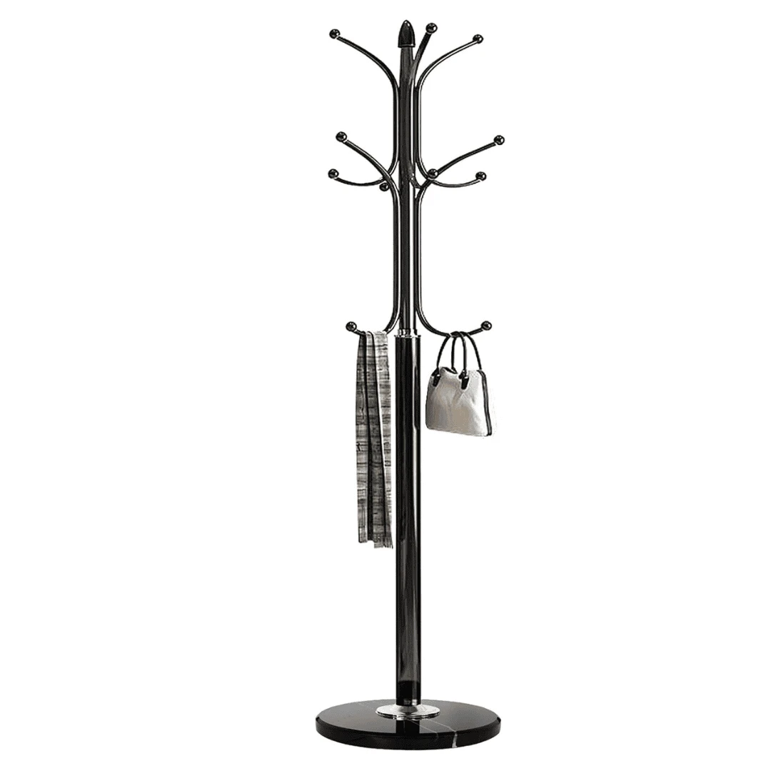 Kertnic Metal Coat Rack Stand with Natural Marble Base, Free Standing Hall Tree with 12 Hooks for Hanging Scarf, Bag, Jacket, Home Entry-way Hat Hanger Organizer (Black)