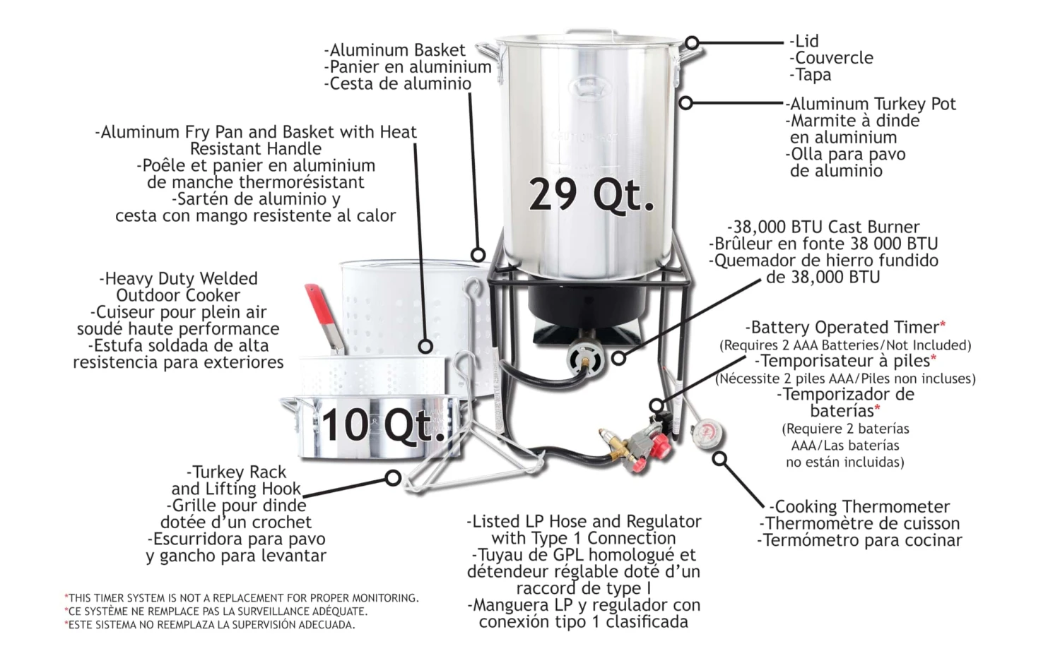 Fry up to a 20 pound turkey outdoors, or fry fresh filets to a crispy golden brown with this King Kooker Portable Propane Outdoor Cooker Package with Two Aluminum Pots! Fry the perfect turkey at your next feast, boil corn and potatoes or fry the fresh catch of the day! Try the suggestions in the detailed instruction/recipe booklet, or create your own favorites! King Kooker lets you eat like a King! CSA Design Certified Unit.