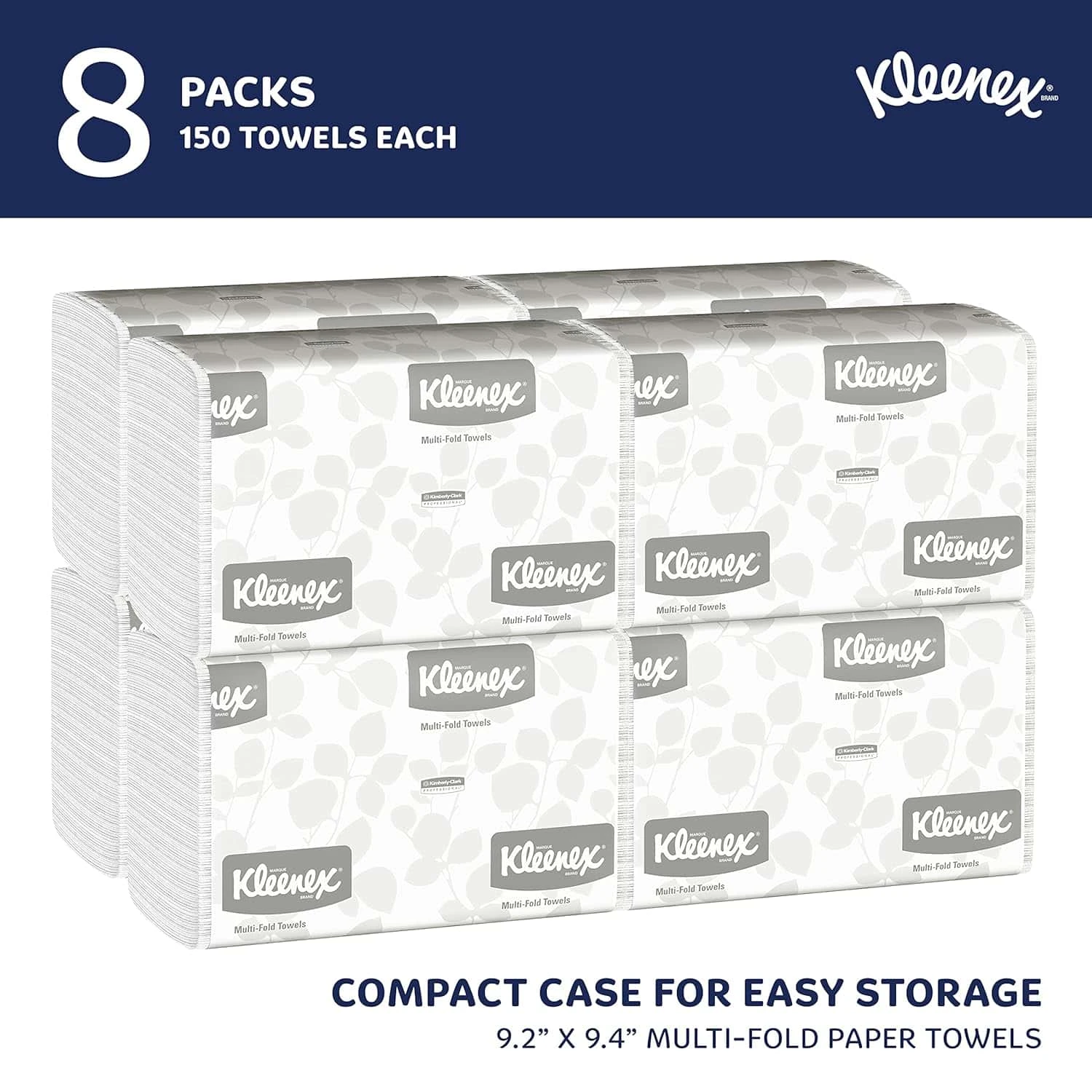 Kleenex Multifold Paper Towels (02046), 1-Ply, 9.2″ x 9.4″ sheets, White, (150 Sheets/Pack, 8 Packs/Case, 1,200 Sheets/Case)