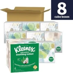 Kleenex Soothing Lotion Facial Tissues feature 3 layers infused with a touch of Coconut Oil, Aloe and Vitamin E. Daily moisturizers nourish and help protect skin during all seasons. Kleenex Soothing Lotion tissues are preferred 2:1 vs. leading lotion tissue brand, making Kleenex America’s preferred lotion tissue. These tissues come in 8 cube boxes, with 65 facial tissues in each box. Kleenex lotion tissue boxes are available in a variety of colors, designs, and sizes to complement your home decor. Actual package designs may vary from image shown. Pamper yourself with indulgent lotion softness and dependable strength. Skip the store and have Kleenex Soothing Lotion facial tissues delivered!
