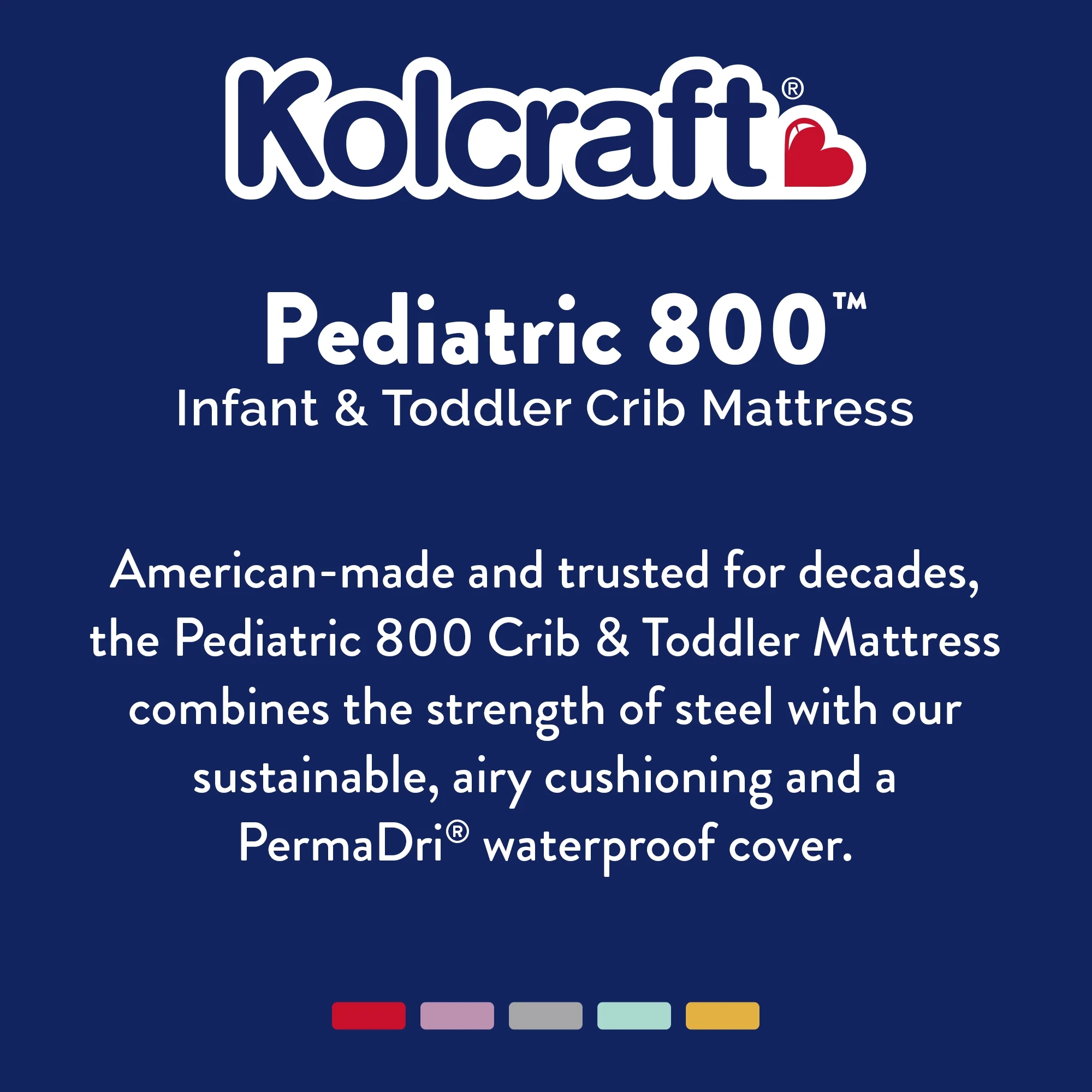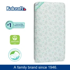 The Kolcraft Pediatric 800 Baby Crib Mattress and Toddler Bed Mattress offers 80 durability tested, extra firm posture supportive coils that respond to baby’s movement while thick and airy cushioning provides support and comfort all around. This baby bed mattress has hypoallergenic materials and no added flame retardants, making it a safe space for baby’s slumbers. The baby crib mattress also has a reinforced waterproof surface that protects baby’s mattress inside and out and can easily be cleaned with a damp cloth. An airflow pocket allows the baby mattress to safely breathe without metal vent holes – an original Kolcraft design. The Kolcraft Pediatric is tested for safety including GREENGUARD GOLD Air Quality Certified to help ensure a healthier sleeping environment for babies (the GOLD standard is a stringent test for children’s products). It also complies with the CPSIA testing, is made without lead or harsh phthalates, and conforms to ASTM crib mattress standards for safety and quality including firmness, fit and durability. Lastly, the Kolcraft Pediatric fits U.S. standard baby cribs and toddler beds (measures 51.63” L x 27.25” W x 5” H) so you can pair it with your favorite baby crib or toddler bed. Kolcraft is a family-owned and operated company, a premier crib mattress/toddler mattress manufacturer that parents have depended on for decades.