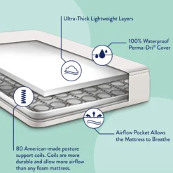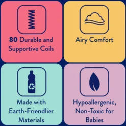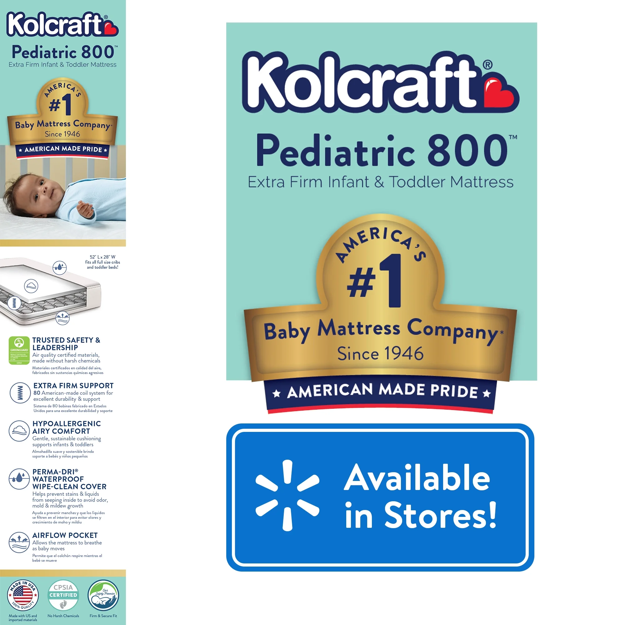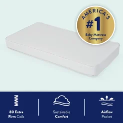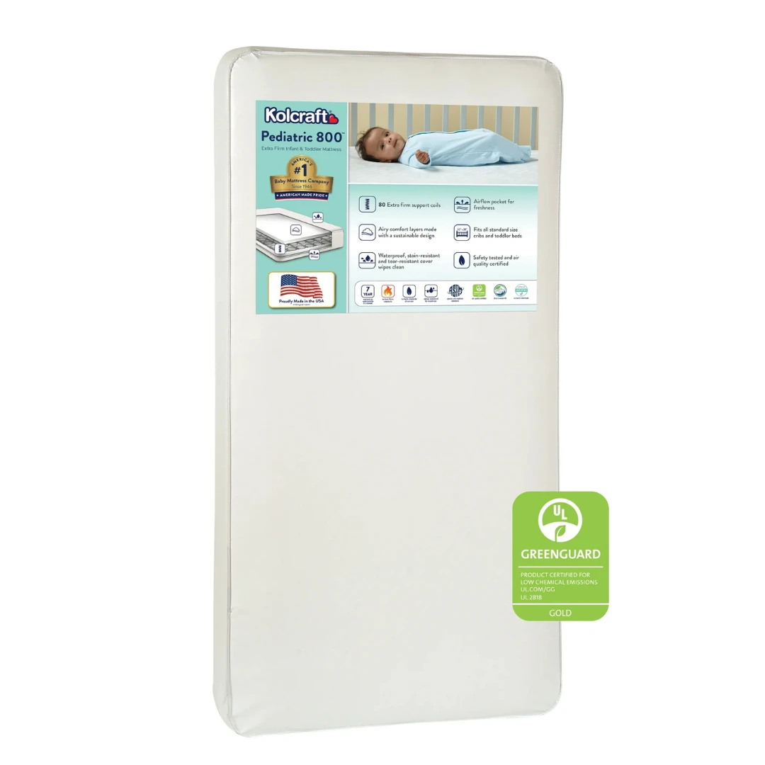 The Kolcraft Pediatric 800 Baby Crib Mattress and Toddler Bed Mattress offers 80 durability tested, extra firm posture supportive coils that respond to baby’s movement while thick and airy cushioning provides support and comfort all around. This baby bed mattress has hypoallergenic materials and no added flame retardants, making it a safe space for baby’s slumbers. The baby crib mattress also has a reinforced waterproof surface that protects baby’s mattress inside and out and can easily be cleaned with a damp cloth. An airflow pocket allows the baby mattress to safely breathe without metal vent holes – an original Kolcraft design. The Kolcraft Pediatric is tested for safety including GREENGUARD GOLD Air Quality Certified to help ensure a healthier sleeping environment for babies (the GOLD standard is a stringent test for children’s products). It also complies with the CPSIA testing, is made without lead or harsh phthalates, and conforms to ASTM crib mattress standards for safety and quality including firmness, fit and durability. Lastly, the Kolcraft Pediatric fits U.S. standard baby cribs and toddler beds (measures 51.63” L x 27.25” W x 5” H) so you can pair it with your favorite baby crib or toddler bed. Kolcraft is a family-owned and operated company, a premier crib mattress/toddler mattress manufacturer that parents have depended on for decades.
