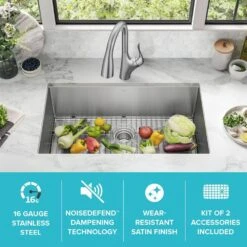 KRAUS Standart PRO Kitchen Sinks feature clean lines and tight-radius corners for a streamlined modern look. Undermount design creates a clean transition between sink and countertop with no exposed mounting deck to trap debris. Made with heavy-duty TRU16-gauge stainless steel for lasting durability, the spacious single bowl sink offers ample space for large cookware and stacks of dishes. NoiseDefend sound dampening pads help prevent noise and vibration. Wear-resistant finish and easy-to-clean rounded corners help reduce build-up over time. Channel grooves and a sloped bottom help improve drainage. The sink comes with a protective bottom grid, drain assembly with cover, mounting hardware, and cut-out templates.