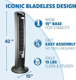 - BLADELESS DESIGN: With a slim, sturdy, bladeless design, the 42″ Lasko Wind Curve Tower Fan fits beautifully into your home and provides cooling comfort. This lightweight fan is easy to assemble, and the carry handle makes it simple to pick up and move