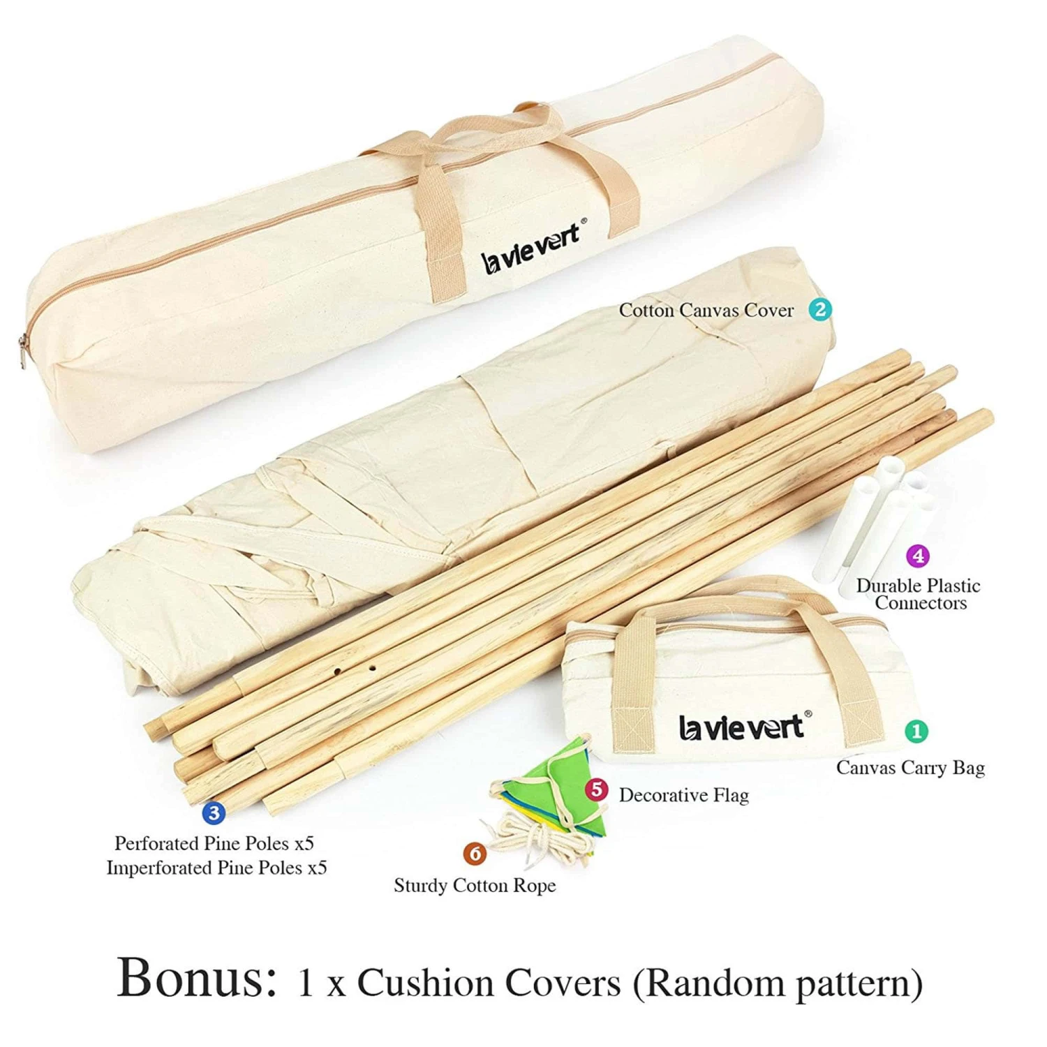 - ACCESSORY – BONUS: 1 X Cushion Cover, 1 X Decorative Banner. 1 X Cotton Canvas Cover, 1 X Canvas Carry Bag, 5 X Perforated Pine Poles (91 X 2 cm / 35.82 X 0.78 inch), 5 X Unperforated Pine Poles (91 X 2 cm / 35.82 X 0.78 inch), 5 X Durable Plastic Connectors.