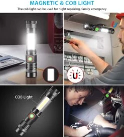 - Strong Magnetic and COB Side Lights: A strong magnet in flashlight tail enables you can attach this LED flashlight to any surface of iron to free your hands. And COB side lights can be used as maintenance, work lights or home emergency backup lights. Pairing with a magnet is the perfect combination.