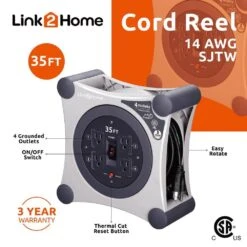 This 35 ft. extension cord storage reel includes 4 grounded outlets and a surge protector. An ideal solution for your garage, backyard or warehouse space, this lightweight, tangle-resistant cord management system keeps your cords organized and tidy. This reel features a heavy-duty comfort handle that is easy to grip, while its compact design makes it easy to store when you’re not using it.