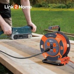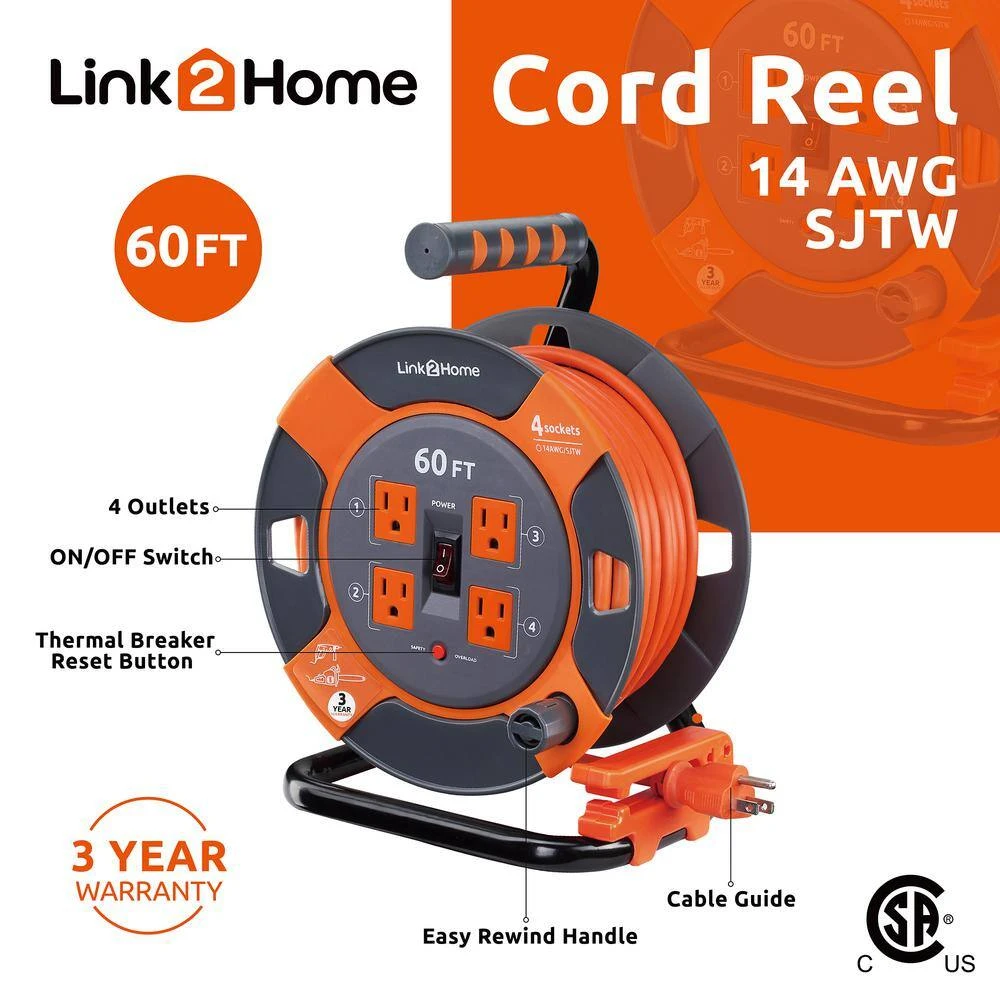 Add power to your warehouse, garage or backyard with the Link2Home Cord Reel 60 ft. Extension Cord with 14 AWG SJTW Cable. The cords stay organized thanks to the reel with a heavy-duty handle and the cord-locking system keeps them safely in place. It’s easy to spot with a high-visibility design and it’ll last you over time with a durable metal frame.