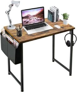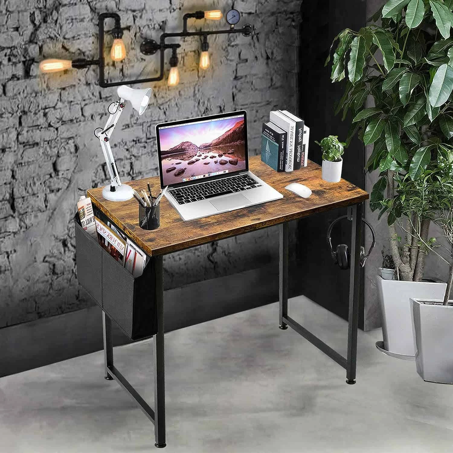 Lufeiya Small Computer Desk Study Table for Small Spaces Home Office 31 Inch Rustic Student Laptop PC Writing Desks with Storage Bag Headphone Hook,Brown