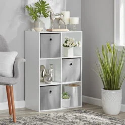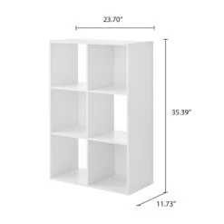 The Mainstays 6-Cube Storage Organizer features six compartments perfectly sized for storing and displaying office supplies, books, clothes, craft supplies, photos, collectibles and so much more! This sturdy bookcase can stand vertically or horizontally to best suit your needs and space. They are compatible with Mainstays 10.5-inch by 10.5-inch collapsible storage bins (sold separately) and available in multiple finishes. Three open-back cube shelves make managing cords and cables easy, while three closed-back shelves help keep items securely housed. Add an accent piece that is both functional and stylish to your living room, family room, home office, playroom, closet and more, with the Mainstays 6-Cube Storage Organizer.