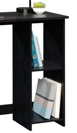 Is limited space in your home bringing you down! Not for long! Create the convenient space you need to work on projects or pay your bills without having to take up a huge amount of space in your home with this desk from the Mainstays collection. This home office desk offers a spacious top surface that provides you with the room you need for all your must-have office essentials like your laptop, notepads, folders, and your hot cup of coffee too. The two storage shelves provide you with a space to easily store and display a variety of items like books, work binders, decorative knick-knacks, and organizing bins. This writing desk is the perfect small space solution. Its charming good looks and functional design make this desk a great addition to any room in your home. Finished in true black oak, this good-looking desk will have you working in no time.