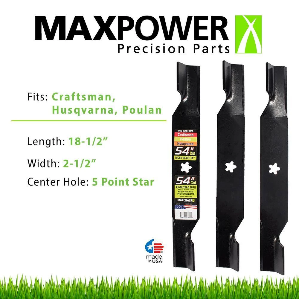 MaxPower’s 561747B includes 3 blade for many 54 in. cut Craftsman, Husqvarna, Poulan mowers. These blades replace OEM #’s 187256 and 532187256. Each blade measures 18-1/2 in. L and 2-1/2 in. W with a 5 point star center hole. Check your owner’s manual to verify that the OEM number of the blade being replaced matches one of the OEM numbers provided for this item. Maxpower blades are manufactured to meet or exceed OEM specifications.