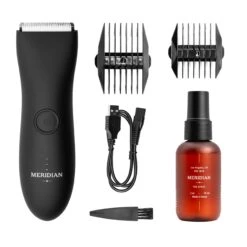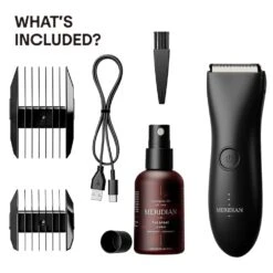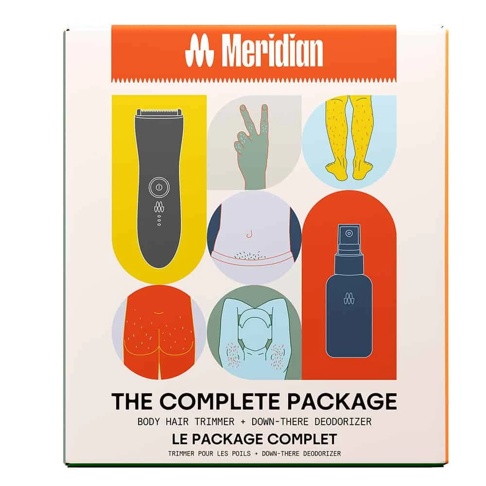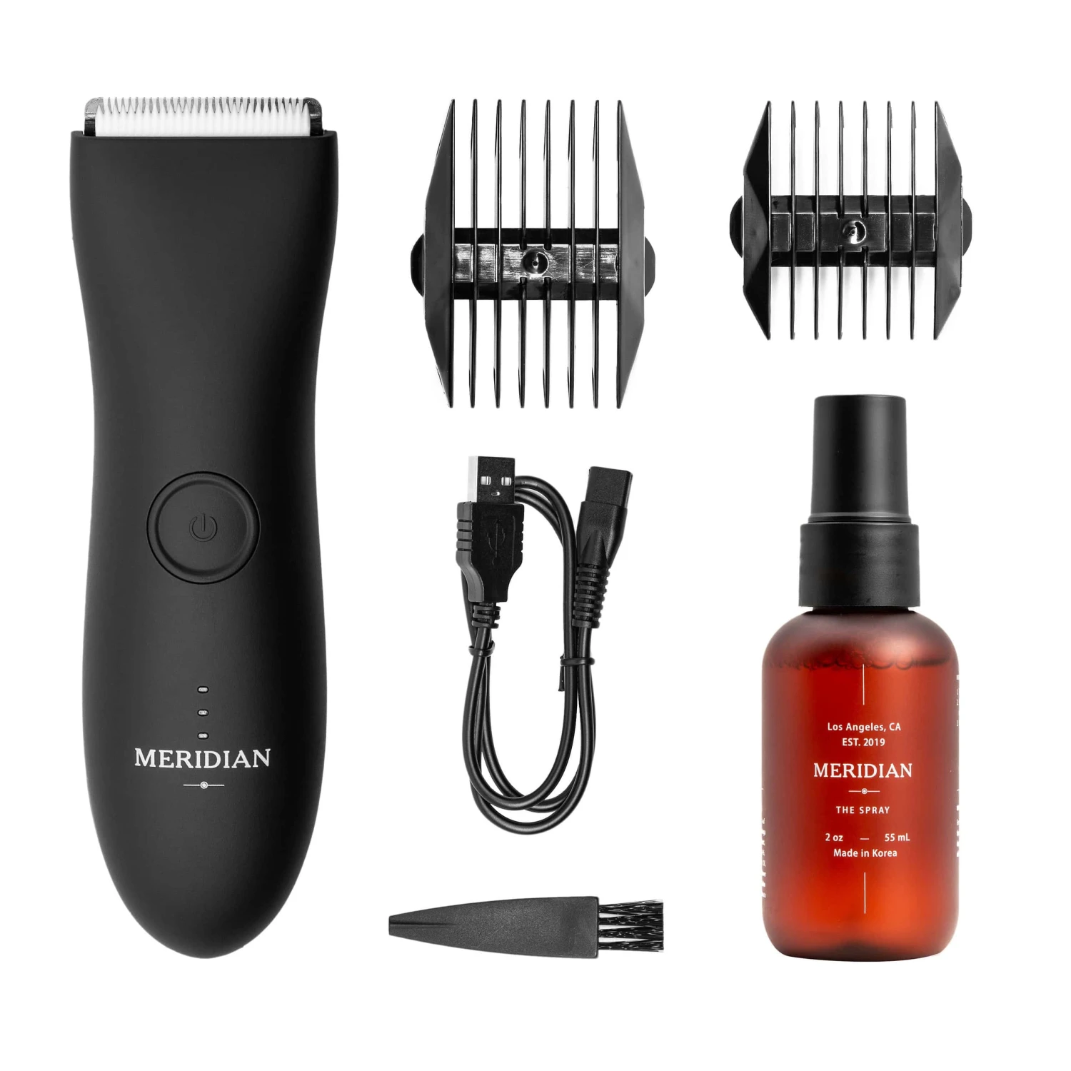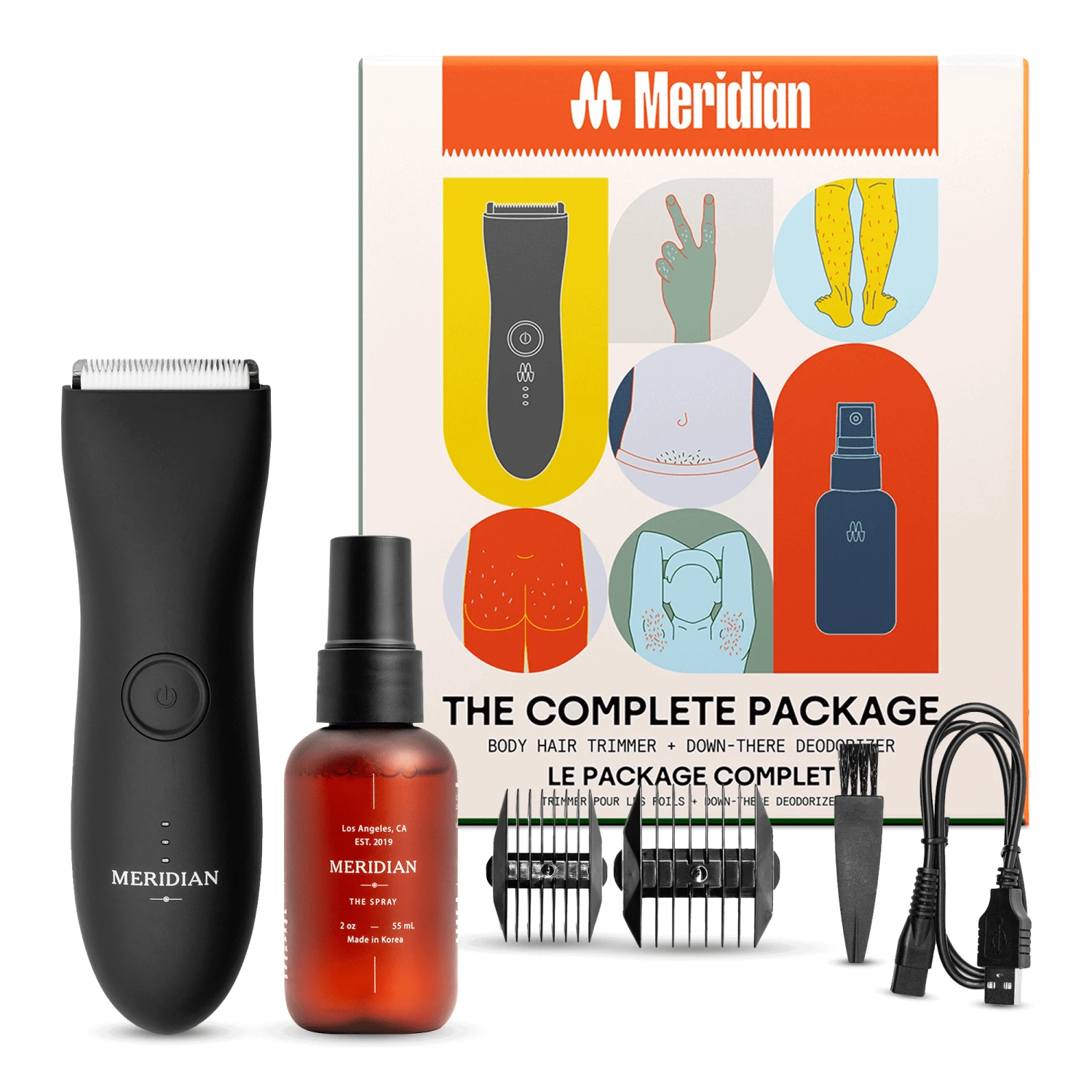 Meridian Complete Package is the ultimate body hair grooming kit, with the essentials for any grooming routine, everywhere on your body. It features our waterproof, rechargeable Trimmer with signature ceramic blades for a pain-free, nick-free shave with a gentle, smooth glide. It allows you to explore 3 different hair lengths so you can rock your body hair however you like it. Comes with a bonus Spray featuring Green Tea and Witch Hazel extract to deodorize and refresh any area. Updated packaging is now available!
