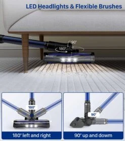 - Anti-tangle Flexible Floor Brush and LED Headlight: Hardwood floor vacuum cleaner comes with the newest V-shaped 2-in-1 brush, suitable for all floor types and effectively solves the problem of tangled hair, flexible 180° swivel and 90° up and down movement allows you to clean in all directions, and the built-in LED headlight illuminates the dark places to ensure that you don’t miss any dirt while cleaning.