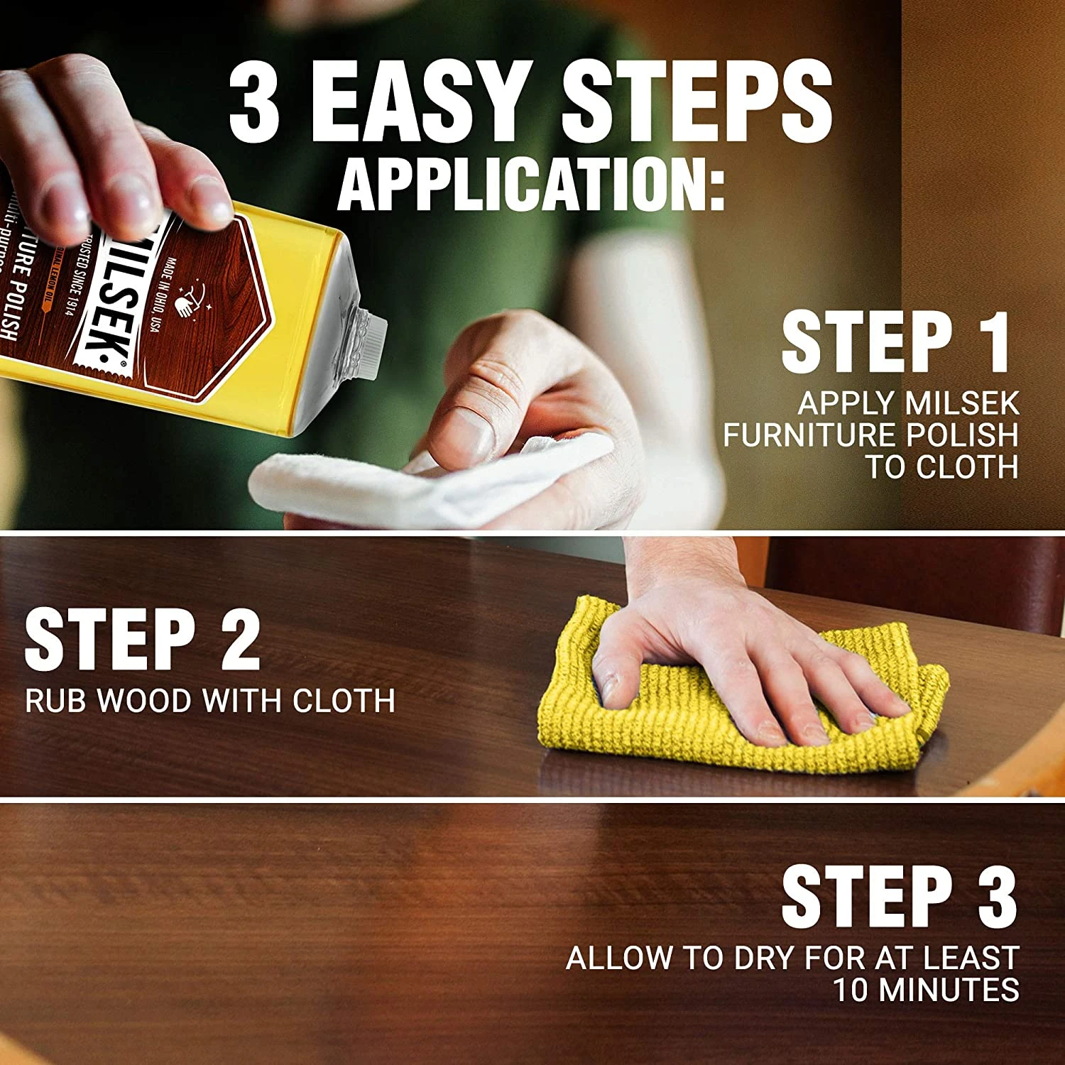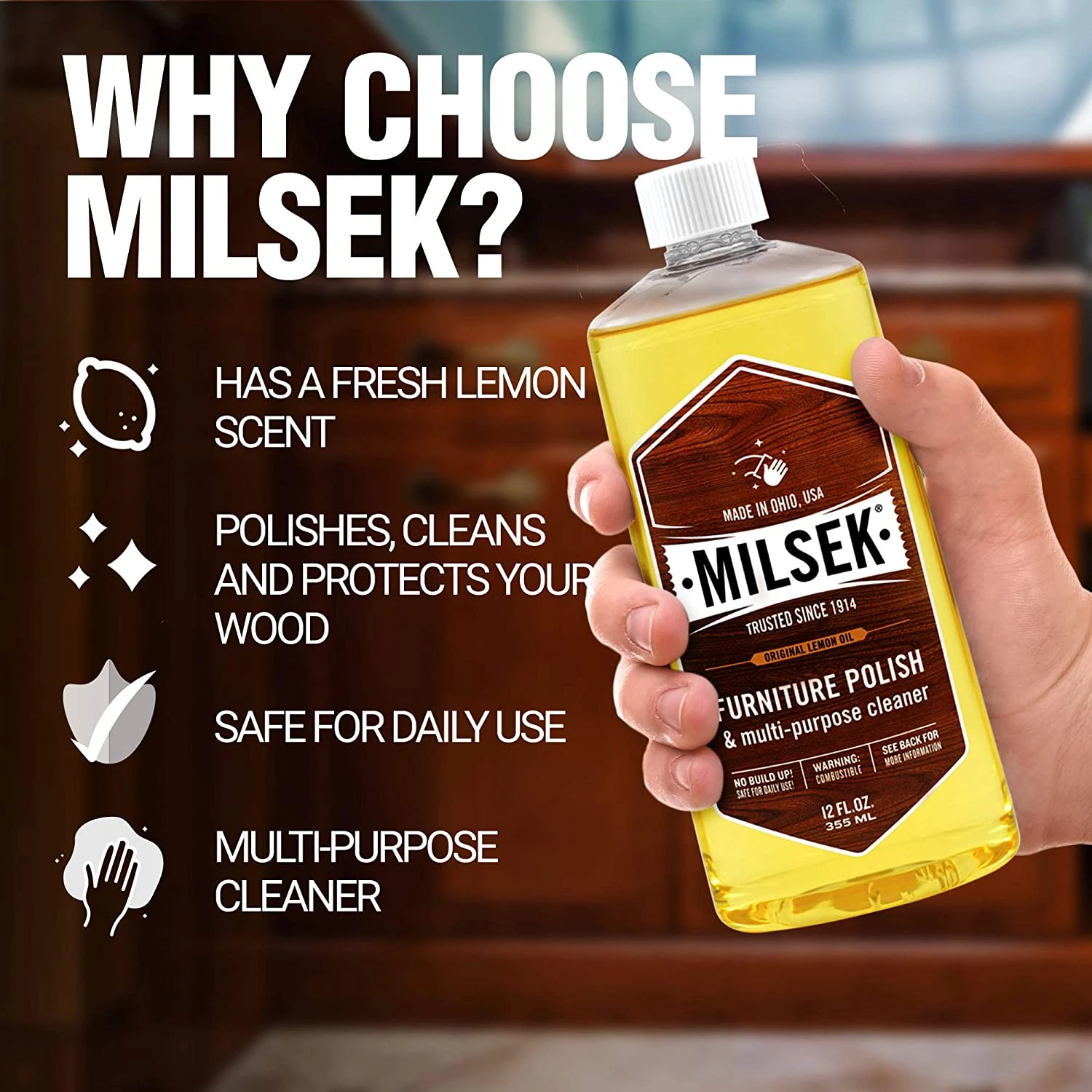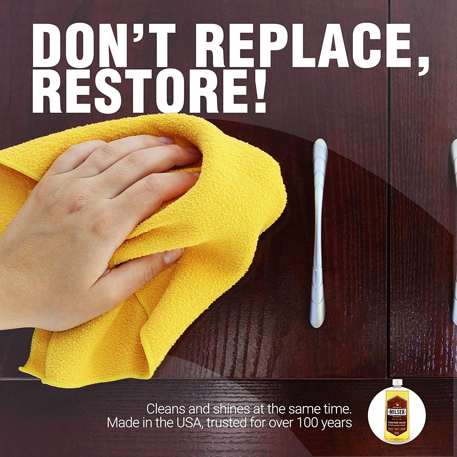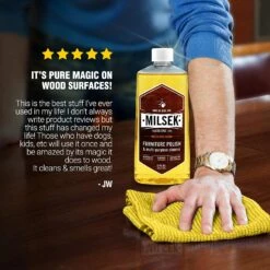 Milsek Furniture Polish and Cleaner with Lemon Oil, 12-Ounce, LM-12. Milsek furniture polish and multi-purpose cleaner is unique because it polishes, cleans and protects your wood in one easy step. Slightly dampen a soft cloth and apply Milsek to it before wiping down your cabinets. Milsek furniture polish and multi-purpose cleaner will remove the grease and grime and restore your wood to its natural luster.