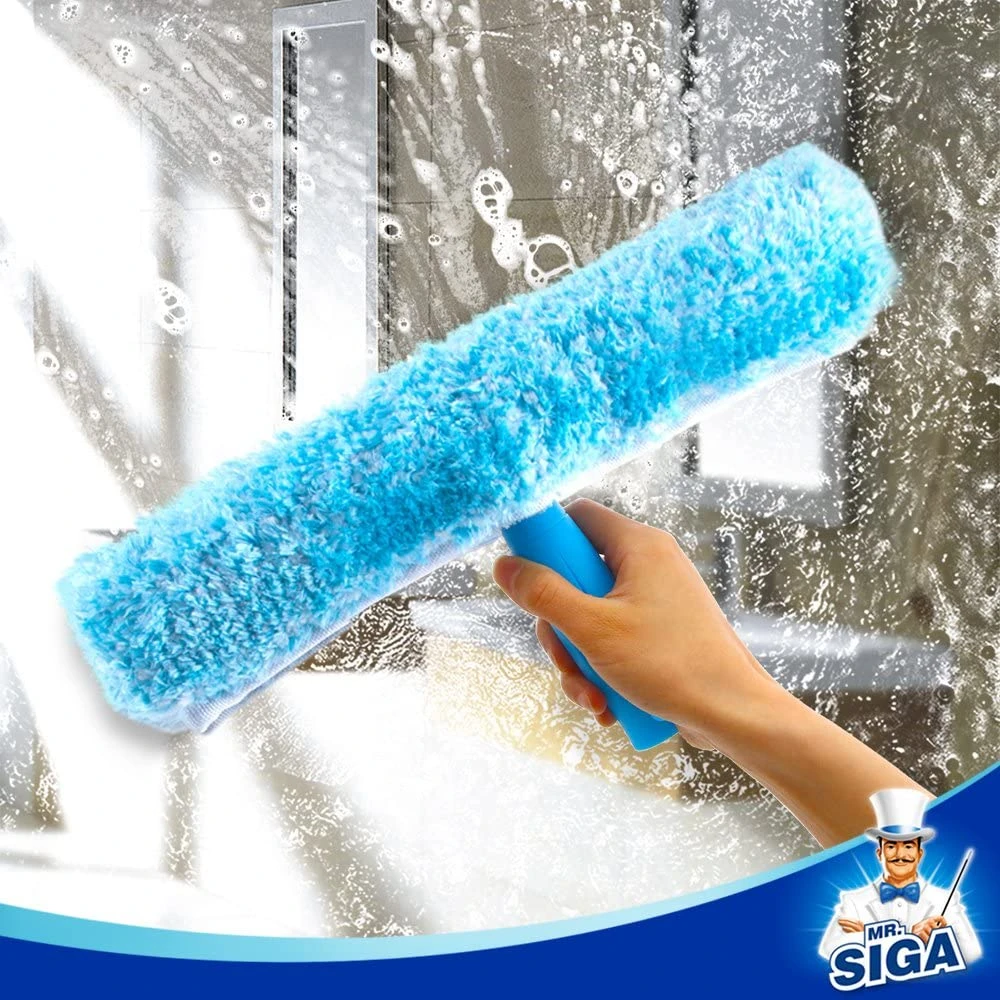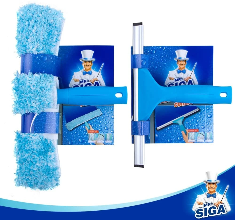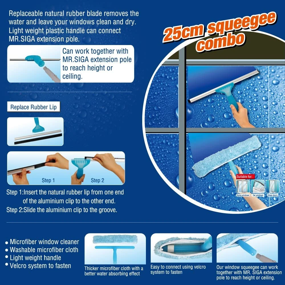 MR.SIGA Professional Window Cleaning Combo – Squeegee & Microfiber Window Scrubber, 10″. MR.SIGA 10-inch (25cm) Window Cleaning Combo includes 2 tools. The 25cm squeegee, great for any smooth surfaces, aluminum clip with replaceable natural rubber blade that removes water effectively and leaves your window clean and streak-free. It’s light weight plastic handle can connect with MR.SIGA telescopic pole for height or ceiling.