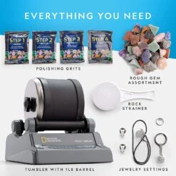 - A COMPLETE HOBBY TUMBLING KIT – Everything you need to create polished gemstones: the tumbler, four polishing grits, sifter, nine types of real rough gemstones, plus a detailed full-color learning guide. Makes a great gift for girls and boys!