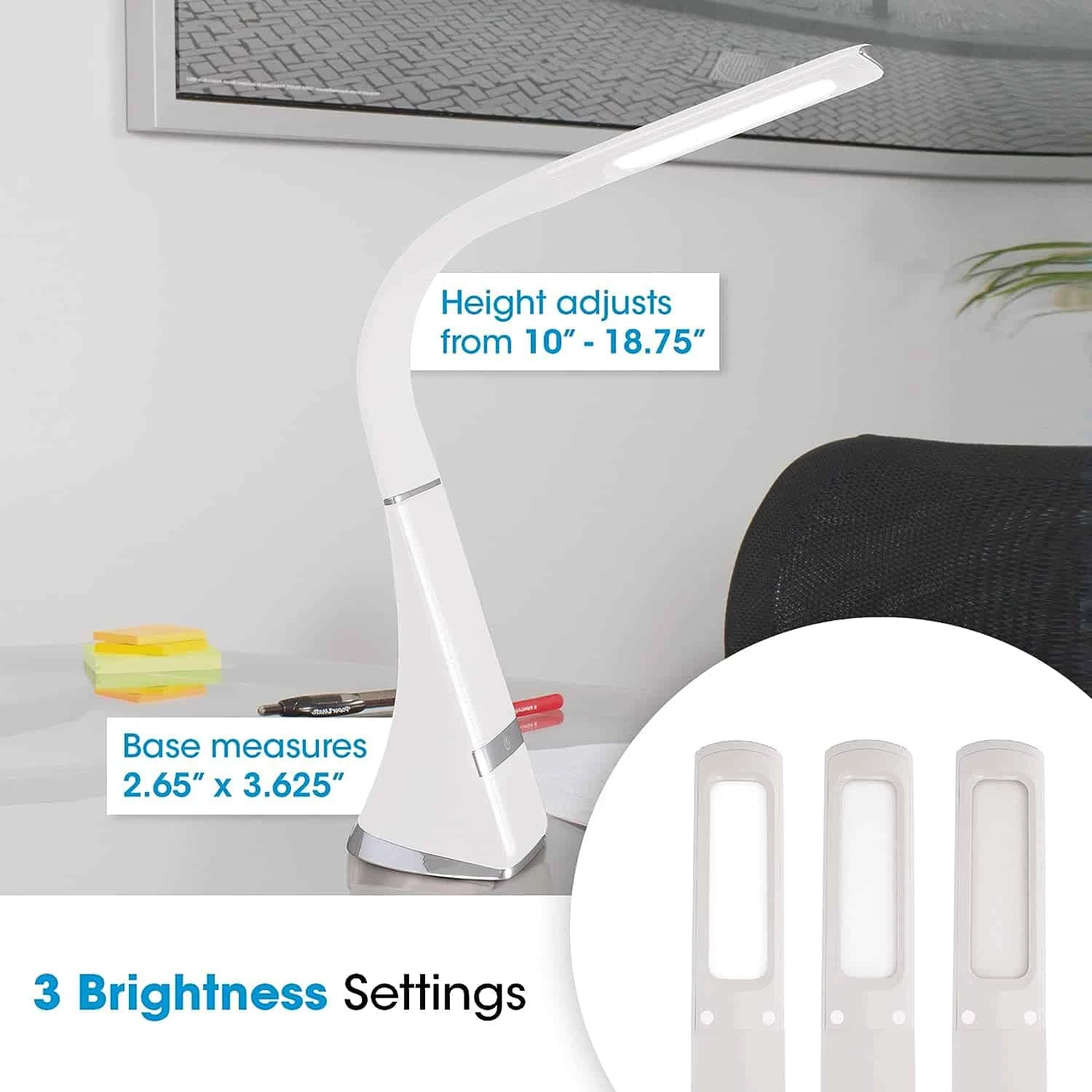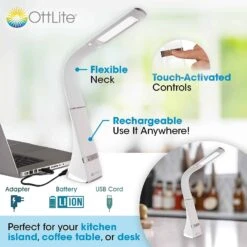 - Bring Healthy Lighting Anywhere: OttLite Recharge LED Desk Lamp in White is perfect for your kitchen island, coffee table, nightstand, and anywhere you want to see and read with incredible comfort and clarity. The flexible neck lets you position light where you need it, extending the height from 10 to 18.75 inches. The base measures 2.65 x 3.625 inches.