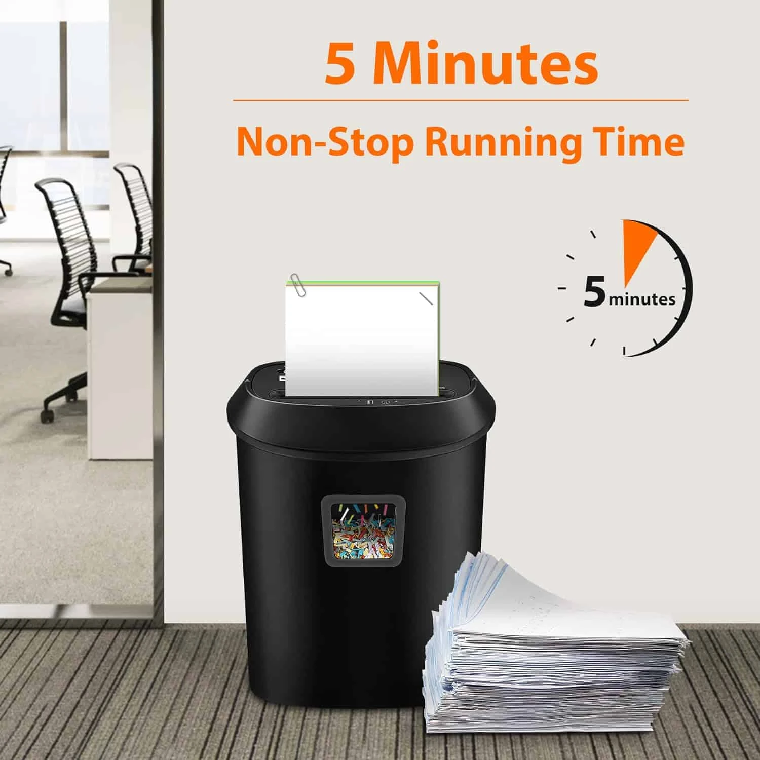 - 5 Minutes Shredding: This paper shredder features extra fast shredding speed with 5 minutes running time and 30 minutes cooling cycle. For safety concern, if it keeps shredding over its maximum working time, shredder will be overheating, after 30 minutes cooling cycle, it can restart to work. Also equipped with overheat LED indicator.