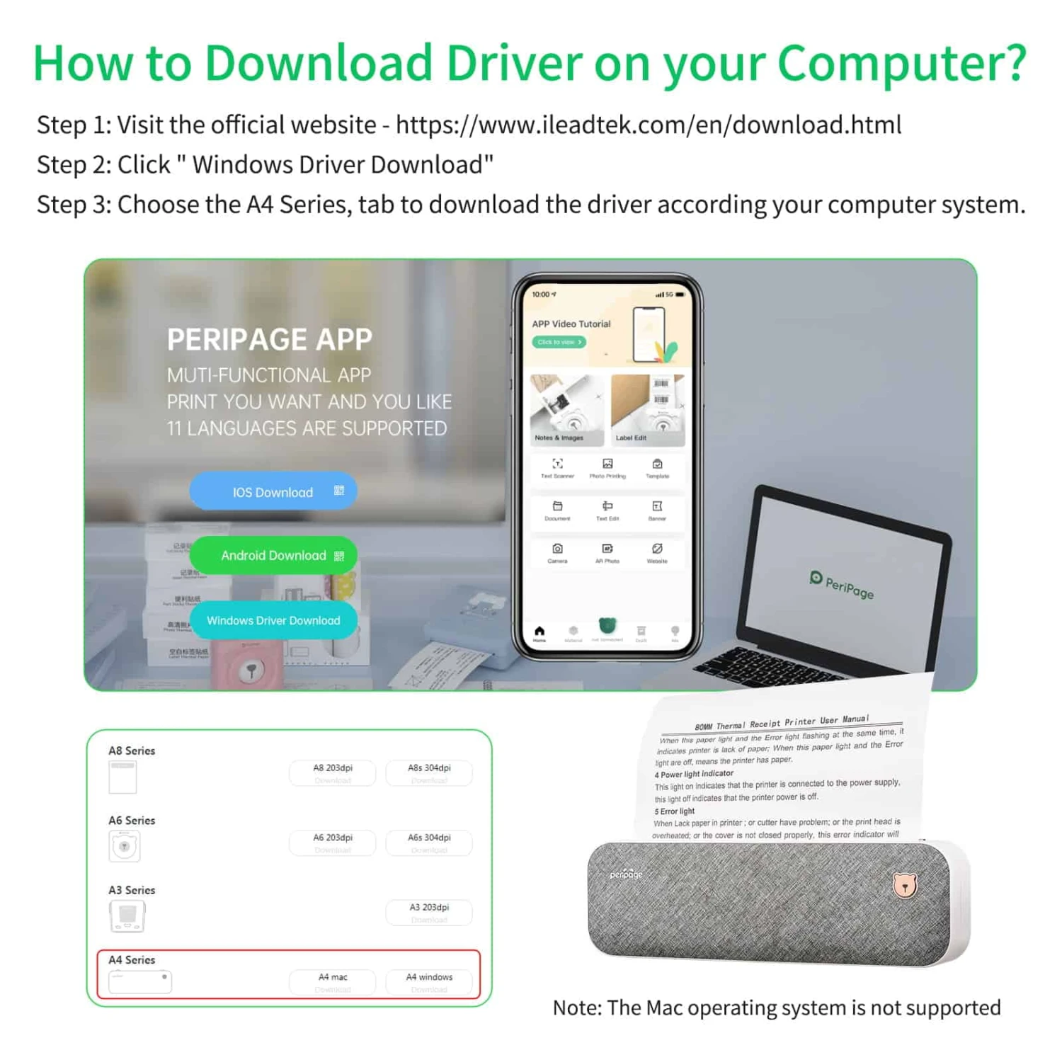 - High Compatibility: Support IOS and Android mobile phone by bt connection. Turn on the printer by pressing the power button for 2sec first. For Mobile Device, download the APP (PeriPage) first and enter it and connect with the machine through BT function. If you need to print with the computer, please download the driver first. (The driver is not support macOS for now)
