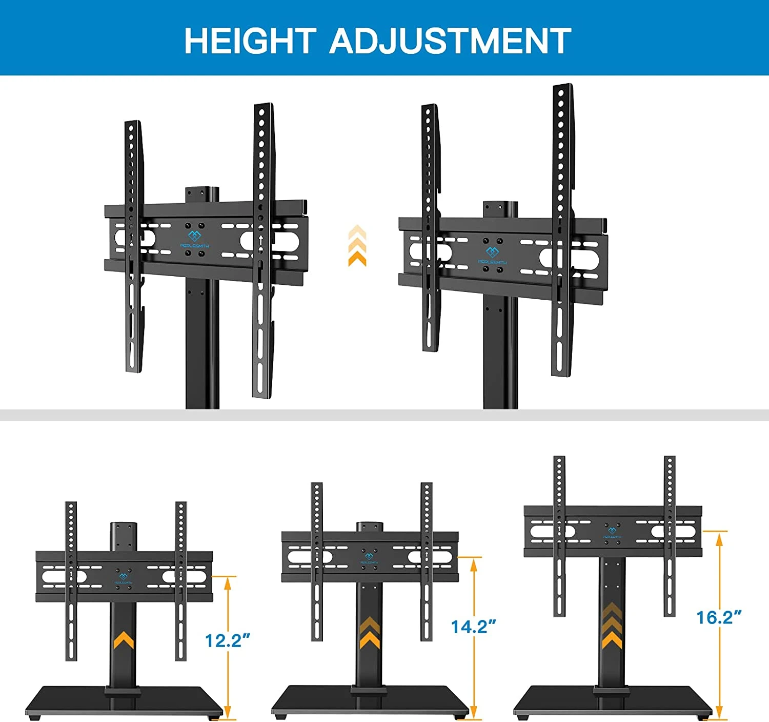 - ADJUSTABLE HEIGHT: This universal TV stand has it all. 15-minute installation, 2 options of mounting TV bracket and 3 sets height adjustment of TV plate to suit different applications or TV sizes