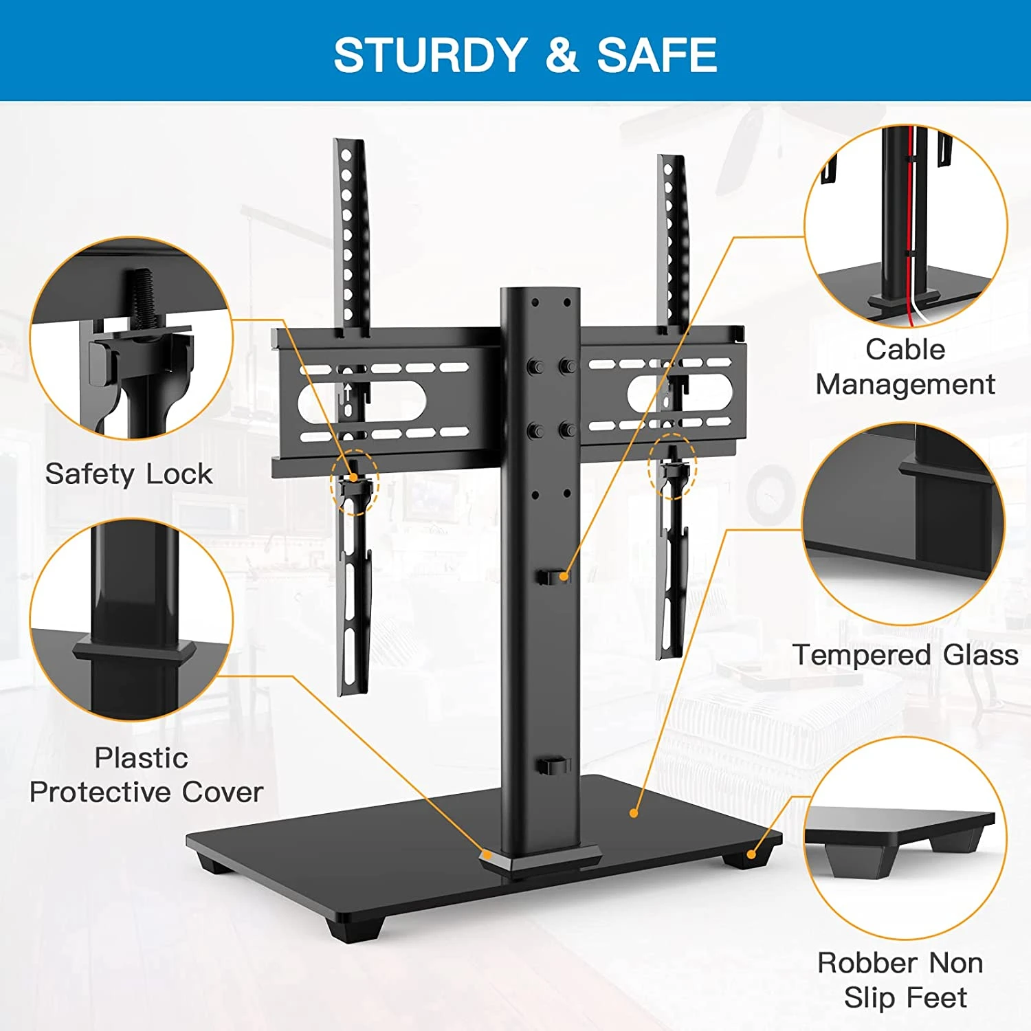 - EASY INSTALLATION: Universal TV stand/base tabletop stand to mount your TV and AV components on an entertainment center or a desk/table. Our product comes with an easy to use instruction manual for quick and easy installation with fittings provided. Install the TV stand without any hassle